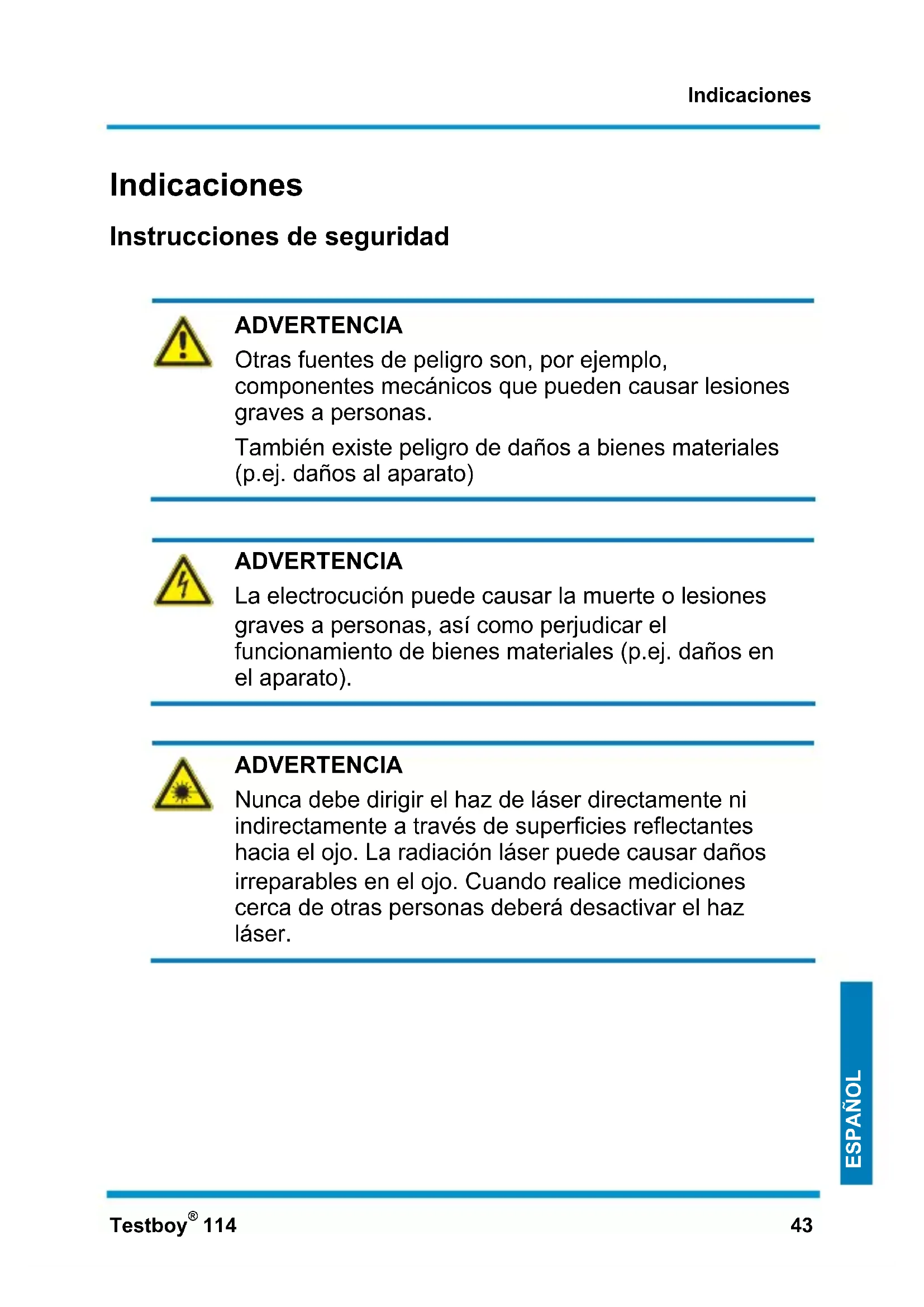 ADVERTENCIA Nunca debe dirigir el haz de láser directamente ni indirectamente a través de superficies reflectantes hacia el ojo. La radiación láser puede causar daños irreparables en el ojo. Cuando realice mediciones cerca de otras personas deberá desactivar el haz láser.Indicaciones 44 Testboy