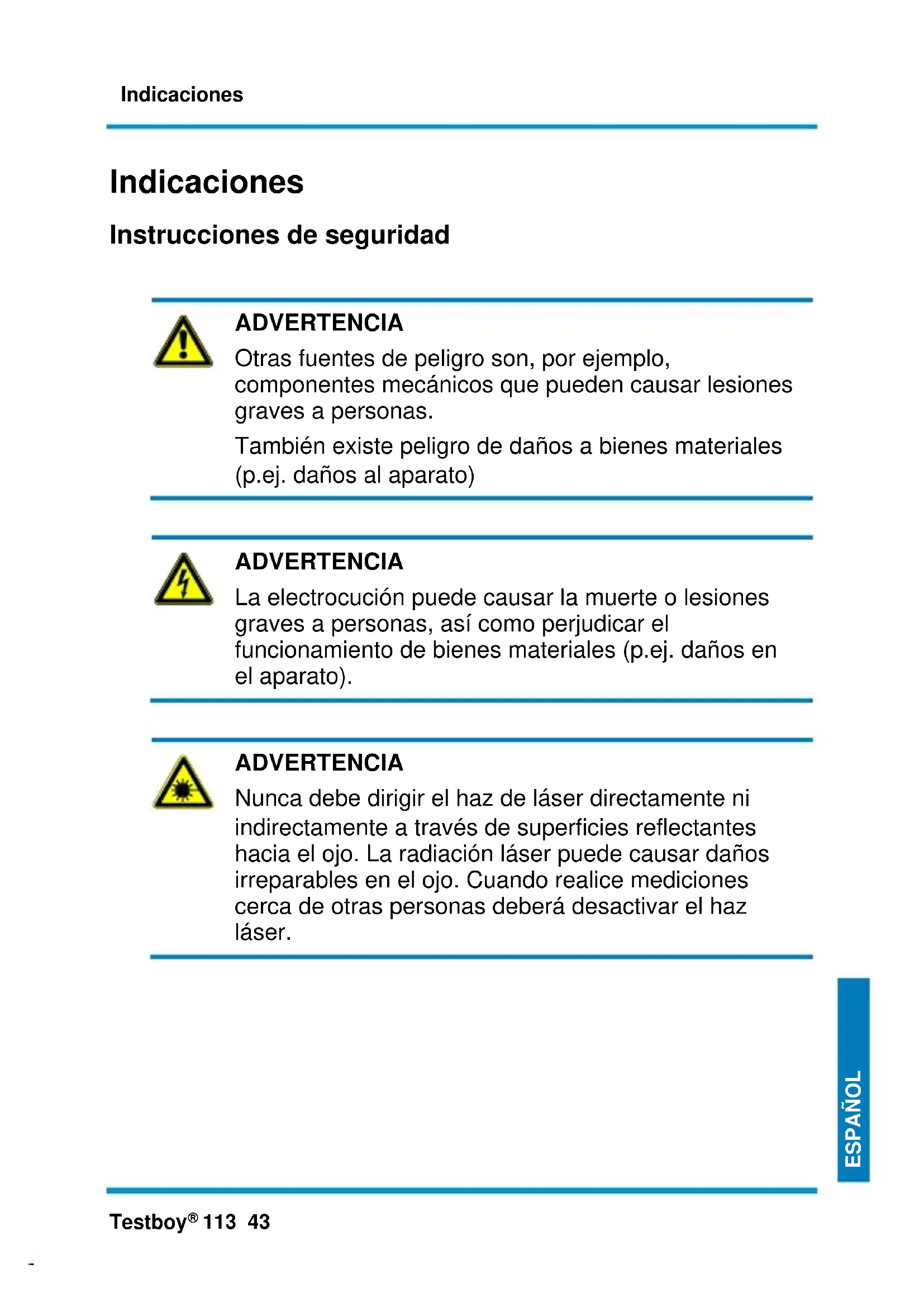 ADVERTENCIA Nunca debe dirigir el haz de láser directamente ni indirectamente a través de superficies reflectantes hacia el ojo. La radiación láser puede causar daños irreparables en el ojo. Cuando realice mediciones cerca de otras personas deberá desactivar el haz láser.Indicaciones 44 Testboy