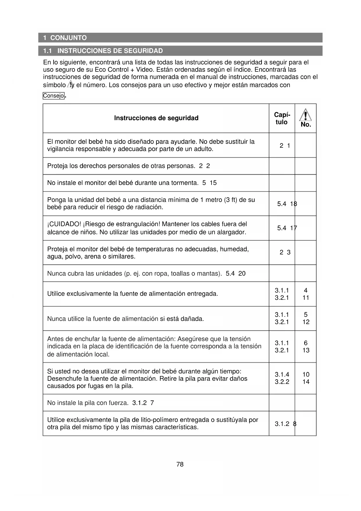 En lo siguiente, encontrará una lista de todas las instrucciones de seguridad a seguir para el uso seguro de su Eco Control + Video. Están ordenadas según el índice. Encontrará las instrucciones de seguridad de forma numerada en el manual de instrucciones, marcadas con el símbolo y el número. Los consejos para un uso efectivo y mejor están marcados con Consejo