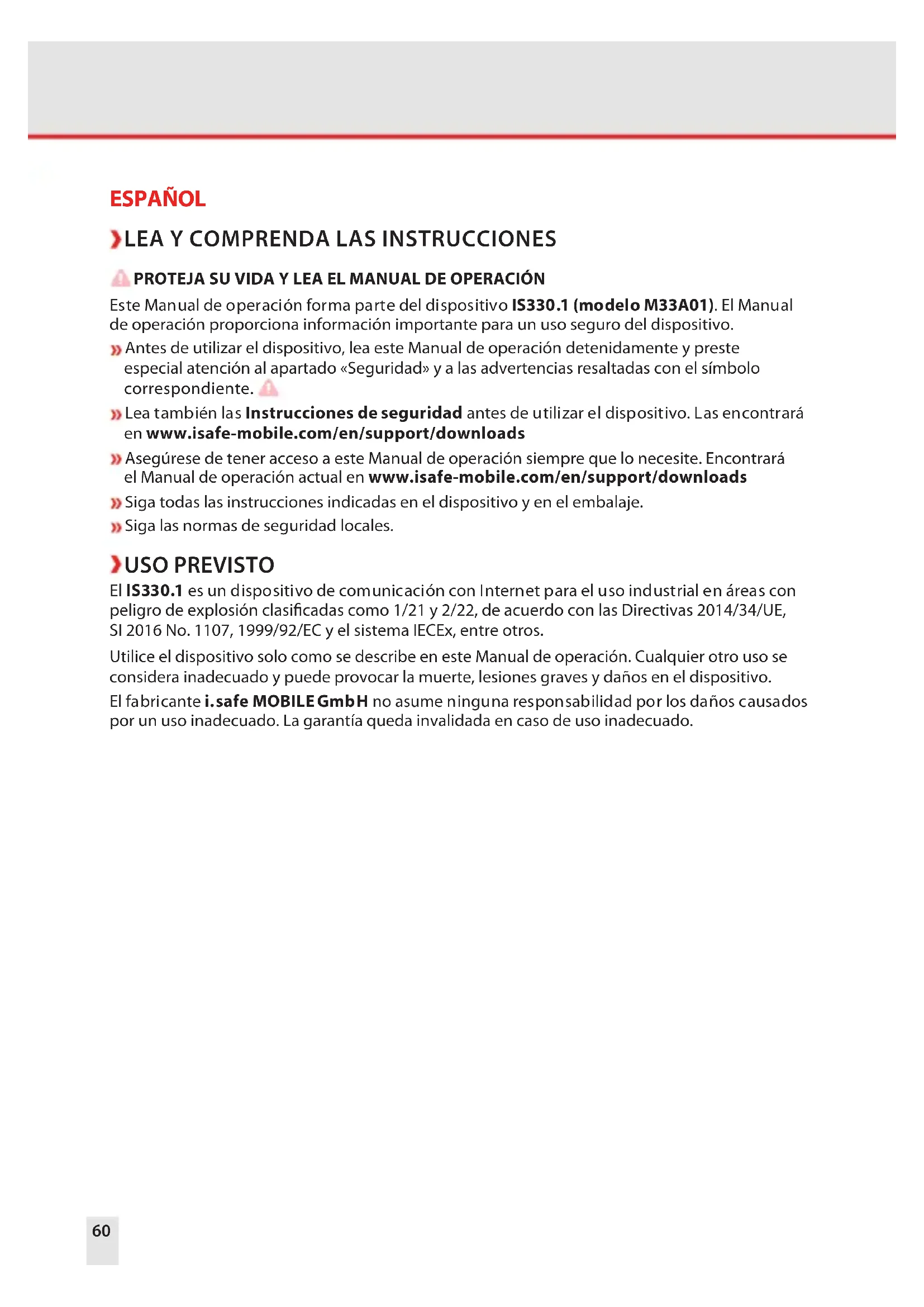 PROTEJA SU VIDA Y LEA EL MANUAL DE OPERACIÓN Este Manual de operación forma parte del dispositivo IS330.1 (modelo M33A01). El Manual de operación proporciona información importante para un uso seguro del dispositivo. Antes de utilizar el dispositivo, lea este Manual de operación detenidamente y preste especial atención al apartado «Seguridad» y a las advertencias resaltadas con el símbolo correspondiente. Lea también las Instrucciones de seguridad antes de utilizar el dispositivo. Las encontrará en www.isafe-mobile.com/en/support/downloads Asegúrese de tener acceso a este Manual de operación siempre que lo necesite. Encontrará el Manual de operación actual en www.isafe-mobile.com/en/support/downloads Siga todas las instrucciones indicadas en el dispositivo y en el embalaje. Siga las normas de seguridad locales. USO PREVISTO El IS330.1 es un dispositivo de comunicación con Internet para el uso industrial en áreas con peligro de explosión clasicadas como 1/21 y 2/22, de acuerdo con las Directivas 2014/34/UE, SI 2016 No. 1107, 1999/92/EC y el sistema IECEx, entre otros. Utilice el dispositivo solo como se describe en este Manual de operación. Cualquier otro uso se considera inadecuado y puede provocar la muerte, lesiones graves y daños en el dispositivo. El fabricante i.safe MOBILE GmbH no asume ninguna responsabilidad por los daños causados por un uso inadecuado. La garantía queda invalidada en caso de uso inadecuado.ES 61 GARANTÍA Puede encontrar las condiciones de la garantía en www.isafe-mobile.com/en/support/service En caso de daños causados por virus informáticos descargados durante el uso de las funciones de Internet, la responsabilidad será del usuario. No existe el derecho de recurso contra i.safe MOBILE GmbH.