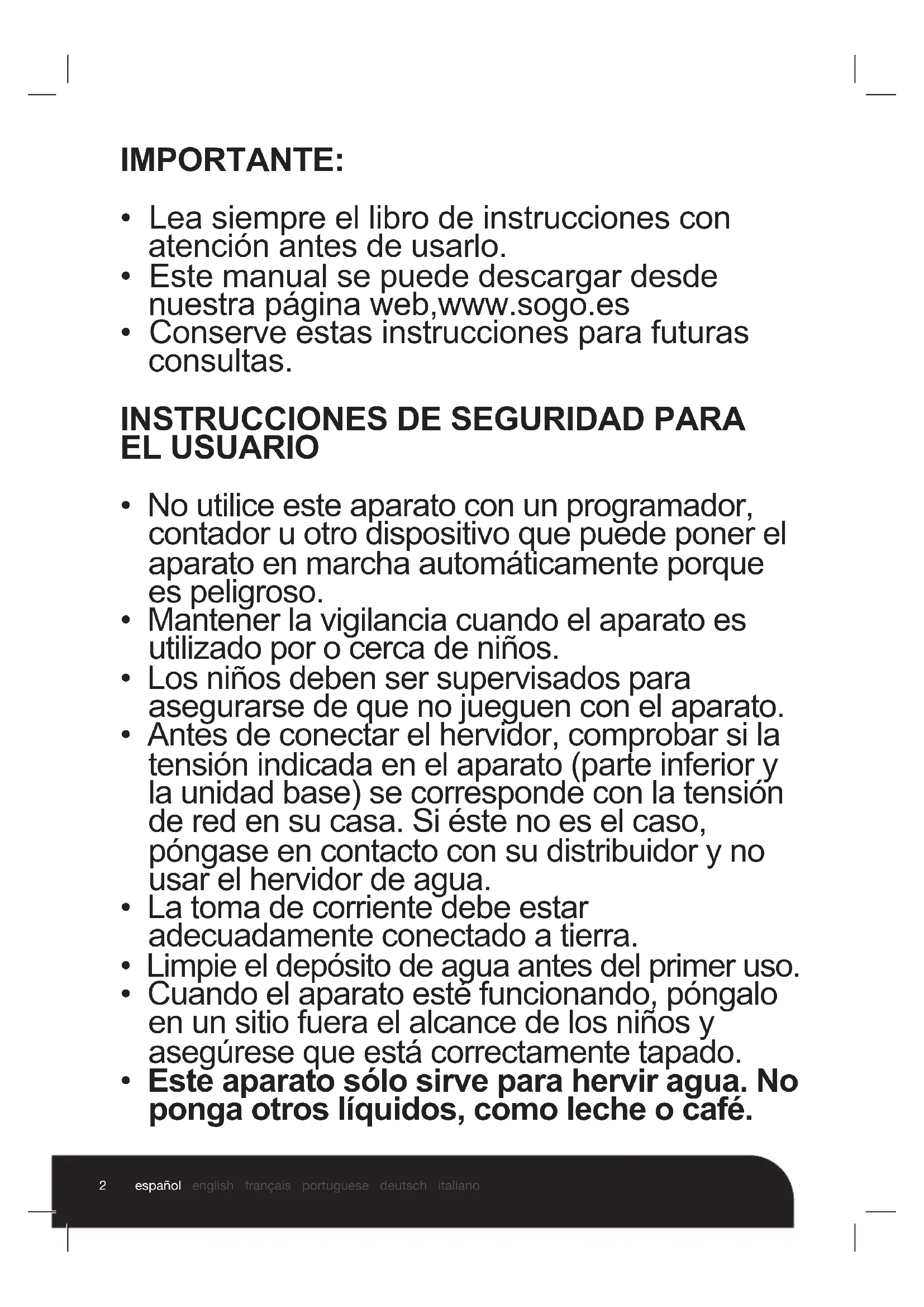- Este aparato sólo sirve para hervir agua. No ponga otros líquidos, como leche o café.3 español english français portuguese deutsch italiano