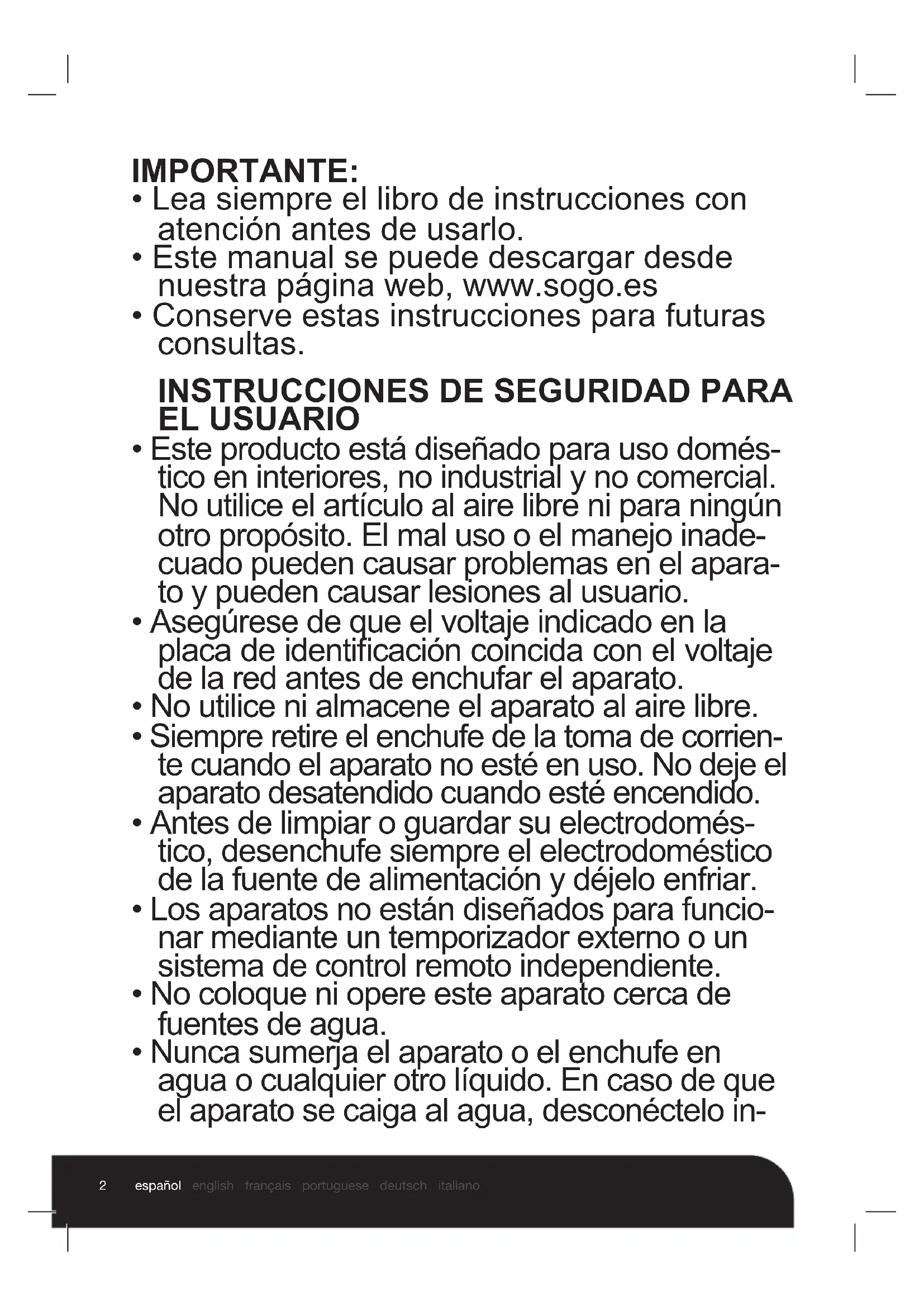 - Nunca sumerja el aparato o el enchufe en agua o cualquier otro líquido. En caso de que el aparato se caiga al agua, desconéctelo in-3 español english français portuguese deutsch italiano mediatamente del suministro principal y lléve- lo a un agente de servicio autorizado para su reparación antes de volver a utilizarlo.