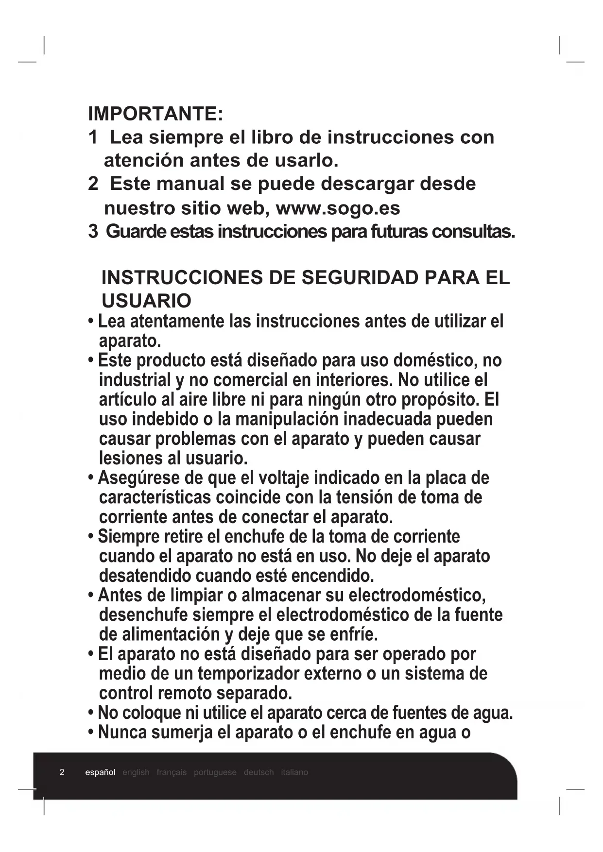 FRIGGITRICE AD ARIA CON FINESTRA DI VISUALIZZAZIONE2 español english français portuguese deutsch italiano IMPORTANTE: 1 Lea siempre el libro de instrucciones con atención antes de usarlo. 2 Este manual se puede descargar desde nuestro sitio web, www.sogo.es 3 Guarde estas instrucciones para futuras consultas.