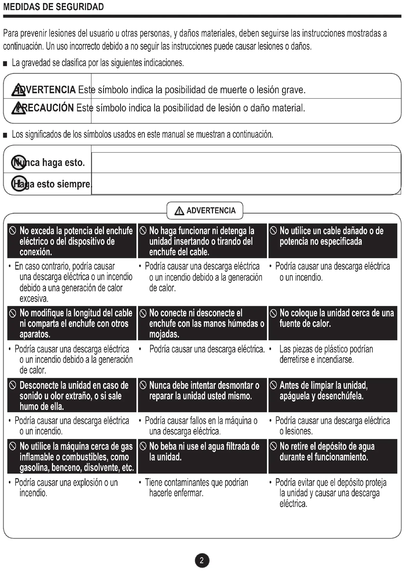 Para prevenir lesiones del usuario u otras personas, y daños materiales, deben seguirse las instrucciones mostradas a continuación. Un uso incorrecto debido a no seguir las instrucciones puede causar lesiones o daños. ■ La gravedad se clasica por las siguientes indicaciones. ADVERTENCIA Este símbolo indica la posibilidad de muerte o lesión grave. PRECAUCIÓN Este símbolo indica la posibilidad de lesión o daño material. ■ Los signicados de los símbolos usados en este manual se muestran a continuación. Nunca haga esto. Haga esto siempre.
