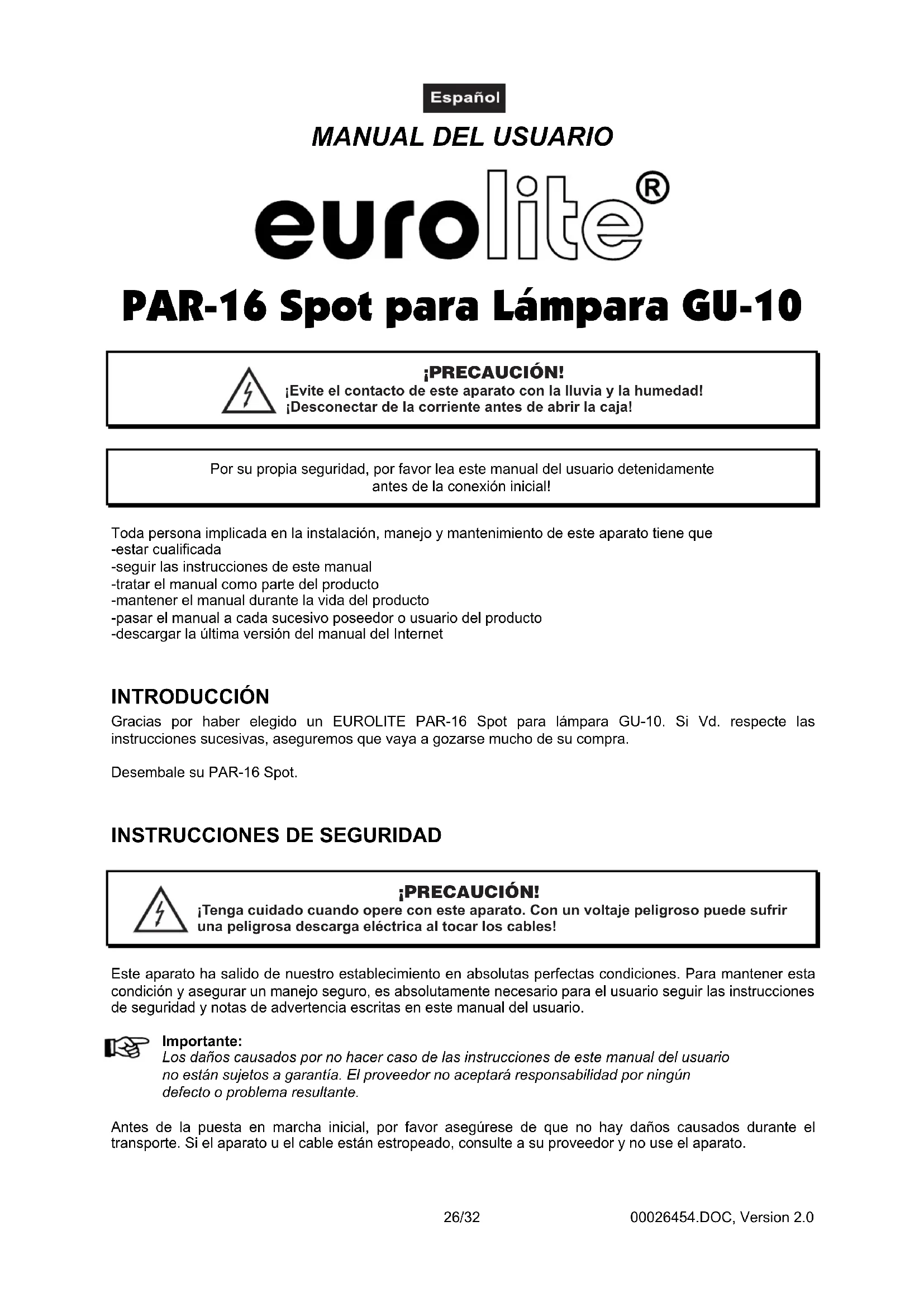 PAR-16 Spot para Lámpara GU-10 ¡Evite el contacto de este aparato con la lluvia y la humedad! Desconectar de la corriente antes de abrir la caja!¡ ¡PRECAUCIÓN! Por su propia seguridad, por favor lea este manual del usuario detenidamente antes de la conexión inicial! Toda persona implicada en la instalación, manejo y mantenimiento de este aparato tiene que -estar cualificada -seguir las instrucciones de este manual -tratar el manual como parte del producto -mantener el manual durante la vida del producto -pasar el manual a cada sucesivo poseedor o usuario del producto -descargar la última versión del manual del Internet INTRODUCCIÓN Gracias por haber elegido un EUROLITE PAR-16 Spot para lámpara GU-10. Si Vd. respecte las instrucciones sucesivas, aseguremos que vaya a gozarse mucho de su compra. Desembale su PAR-16 Spot.