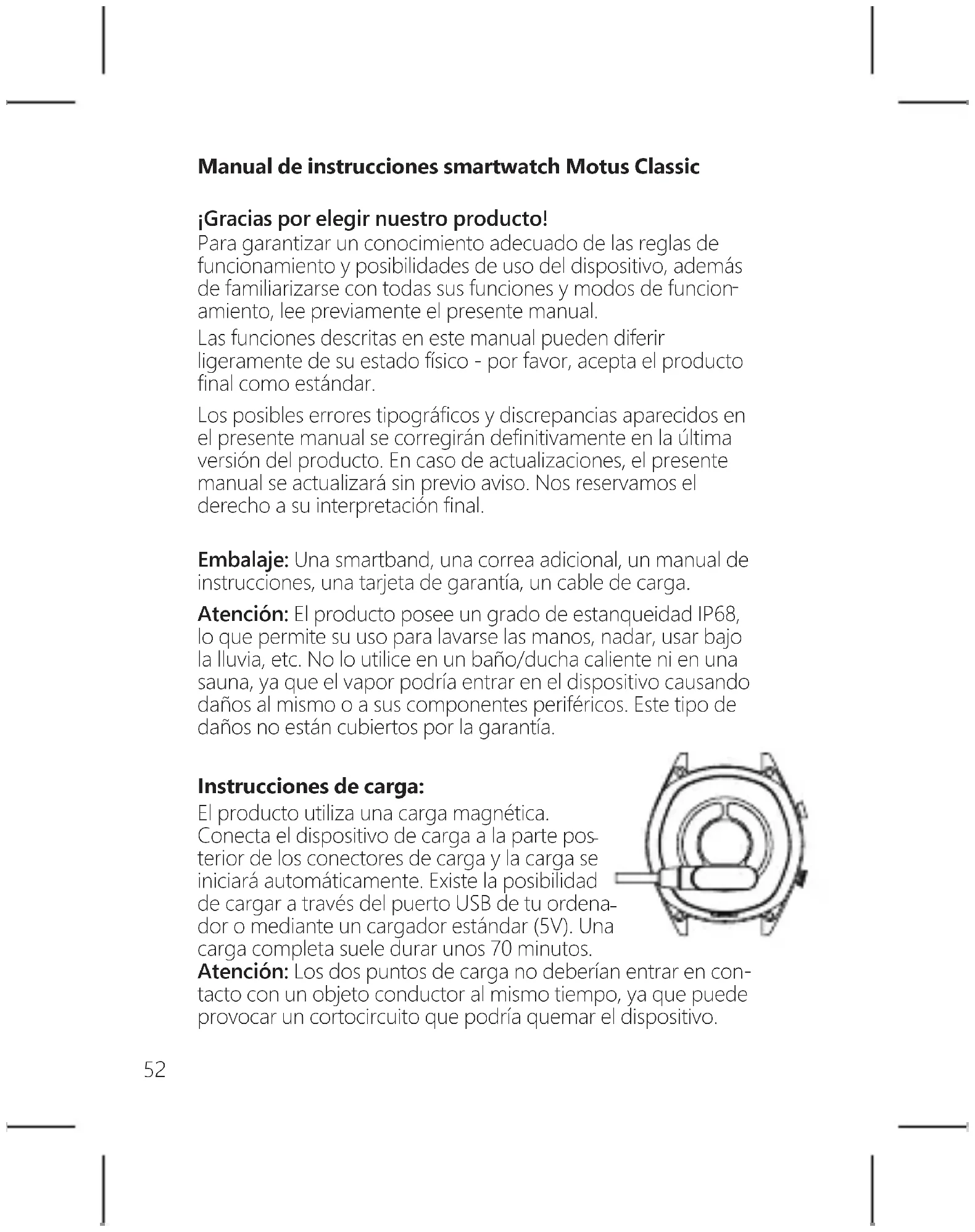 amiento, lee previamente el presente manual. Las funciones descritas en este manual pueden diferir ligeramente de su estado físico - por favor, acepta el producto nal como estándar. Los posibles errores tipográcos y discrepancias aparecidos en el presente manual se corregirán denitivamente en la última versión del producto. En caso de actualizaciones, el presente manual se actualizará sin previo aviso. Nos reservamos el derecho a su interpretación nal. Embalaje: Una smartband, una correa adicional, un manual de instrucciones, una tarjeta de garantía, un cable de carga. Atención: El producto posee un grado de estanqueidad IP68, lo que permite su uso para lavarse las manos, nadar, usar bajo la lluvia, etc. No lo utilice en un baño/ducha caliente ni en una sauna, ya que el vapor podría entrar en el dispositivo causando daños al mismo o a sus componentes periféricos. Este tipo de daños no están cubiertos por la garantía. Instrucciones de carga: El producto utiliza una carga magnética. Conecta el dispositivo de carga a la parte pos