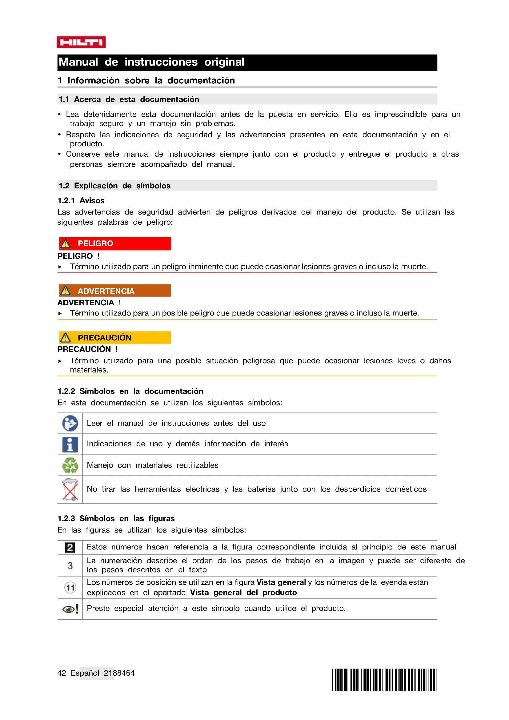 Bajo nuestra exclusiva responsabilidad, declaramos que el producto aquí descrito cumple con las directivas y normas vigentes. Encontrará una reproducción de la declaración de conformidad al final de esta documentación. La documentación técnica se encuentra depositada aquí: Hilti Entwicklungsgesellschaft mbH | Zulassung Geräte | Hiltistraße 6 | 86916 Kaufering, DE 2 Seguridad