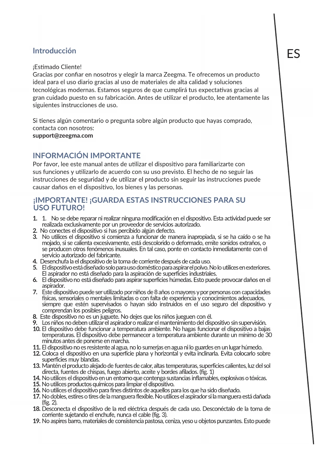 et les tapis dans la poignée sur l’aspirateur Les photos sont à caractère informaf, l’apparence réelle des produits peut varier de celle présentée sur les photos. Bouton d’enroulement 1ES Introducción ¡Esmado Cliente! Gracias por conar en nosotros y elegir la marca Zeegma. Te ofrecemos un producto ideal para el uso diario gracias al uso de materiales de alta calidad y soluciones tecnológicas modernas. Estamos seguros de que cumplirá tus expectavas gracias al gran cuidado puesto en su fabricación. Antes de ulizar el producto, lee atentamente las siguientes instrucciones de uso. Si enes algún comentario o pregunta sobre algún producto que hayas comprado, contacta con nosotros: support@zeegma.com