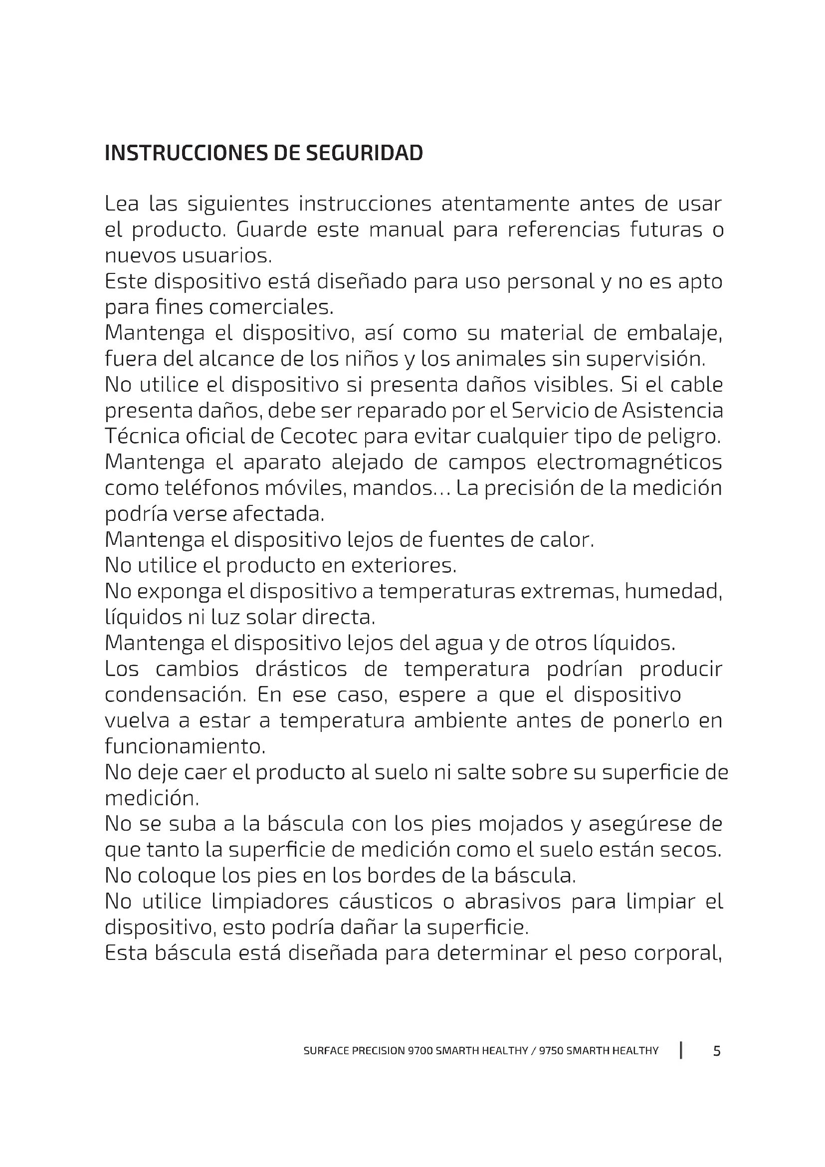 Lea las siguientes instrucciones atentamente antes de usar el producto. Guarde este manual para referencias futuras o nuevos usuarios. Este dispositivo está diseñado para uso personal y no es apto para nes comerciales. Mantenga el dispositivo, así como su material de embalaje, fuera del alcance de los niños y los animales sin supervisión. No utilice el dispositivo si presenta daños visibles. Si el cable presenta daños, debe ser reparado por el Servicio de Asistencia Técnica ocial de Cecotec para evitar cualquier tipo de peligro. Mantenga el aparato alejado de campos electromagnéticos como teléfonos móviles, mandos… La precisión de la medición podría verse afectada. Mantenga el dispositivo lejos de fuentes de calor. No utilice el producto en exteriores. No exponga el dispositivo a temperaturas extremas, humedad, líquidos ni luz solar directa. Mantenga el dispositivo lejos del agua y de otros líquidos. Los cambios drásticos de temperatura podrían producir condensación. En ese caso, espere a que el dispositivo vuelva a estar a temperatura ambiente antes de ponerlo en funcionamiento. No deje caer el producto al suelo ni salte sobre su supercie de medición. No se suba a la báscula con los pies mojados y asegúrese de que tanto la supercie de medición como el suelo están secos. No coloque los pies en los bordes de la báscula. No utilice limpiadores cáusticos o abrasivos para limpiar el dispositivo, esto podría dañar la supercie. Esta báscula está diseñada para determinar el peso corporal,SURFACE PRECISION 9700 SMARTH HEALTHY / 9750 SMARTH HEALTHY