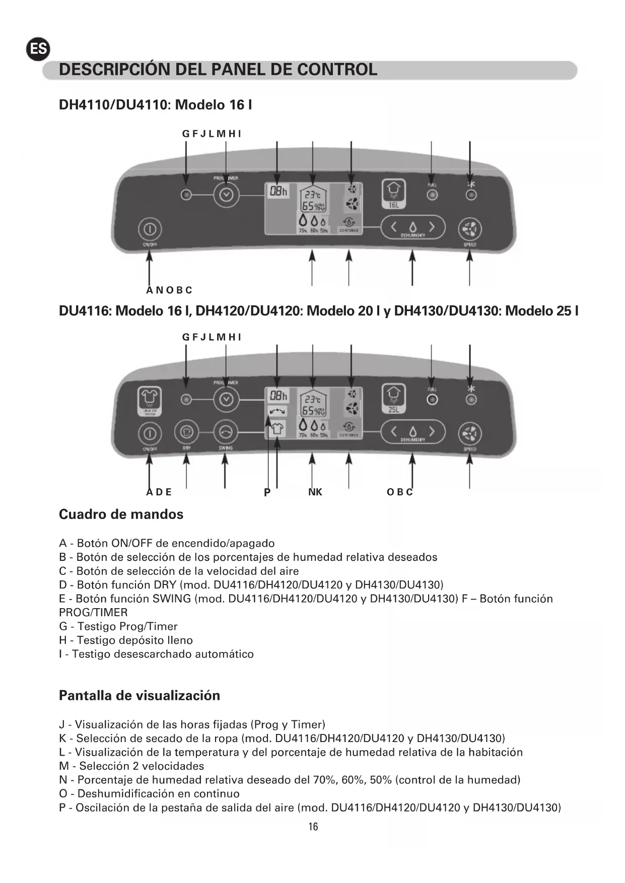 Cuadro de mandos A - Botón ON/OFF de encendido/apagado B - Botón de selección de los porcentajes de humedad relativa deseados C - Botón de selección de la velocidad del aire D - Botón función DRY (mod. DU4116/DH4120/DU4120 y DH4130/DU4130) E - Botón función SWING (mod. DU4116/DH4120/DU4120 y DH4130/DU4130) F – Botón función PROG/TIMER G - Testigo Prog/Timer H - Testigo depósito lleno I - Testigo desescarchado automático Pantalla de visualización J - Visualización de las horas fijadas (Prog y Timer) K - Selección de secado de la ropa (mod. DU4116/DH4120/DU4120 y DH4130/DU4130) L - Visualización de la temperatura y del porcentaje de humedad relativa de la habitación M - Selección 2 velocidades N - Porcentaje de humedad relativa deseado del 70%, 60%, 50% (control de la humedad) O - Deshumidificación en continuo P - Oscilación de la pestaña de salida del aire (mod. DU4116/DH4120/DU4120 y DH4130/DU4130) DH4110/DU4110: Modelo 16 l DU4116: Modelo 16 l, DH4120/DU4120: Modelo 20 l y DH4130/DU4130: Modelo 25 l