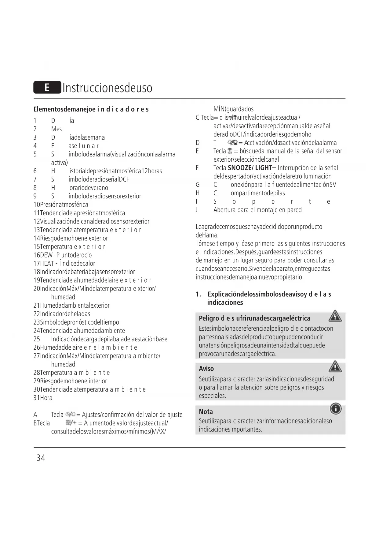 Le soussigné, Hama GmbH &CoKG, déclareque l‘équipement radioélectrique du type [00186418] est conforme àladirective 2014/53/ UE. Le texte complet de la déclaration UE de conformité est disponible àl‘adresse internet suivante: www.hama.com->00186418->Downloads. Bandes de fréquences 433MHz Puissance de radiofréquence maximale 0,222mW34 E Instrucciones de uso Elementos de manejo eindicadores 1Día 2Mes 3Día de la semana 4Faselunar 5Símbolo de alarma (visualización con la alarma activa) 6Historial de presión atmosférica 12 horas 7Símbolo de radio señal DCF 8Horario de verano 9Símbolo de radio sensor exterior 10 Presión atmosférica 11 Tendencia de la presión atmosférica 12 Visualización del canal de radio sensor exterior 13 Tendencia de la temperaturaexterior 14 Riesgo de moho en el exterior 15 Temperaturaexterior 16 DEW -Punto de rocío 17 HEAT-Índice de calor 18 Indicador de batería baja sensor exterior 19 Tendencia de la humedad del aireexterior 20 Indicación Máx/Mín de la temperaturaexterior/ humedad 21 Humedad ambiental exterior 22 Indicador de heladas 23 Símbolo de pronóstico del tiempo 24 Tendencia de la humedad ambiente