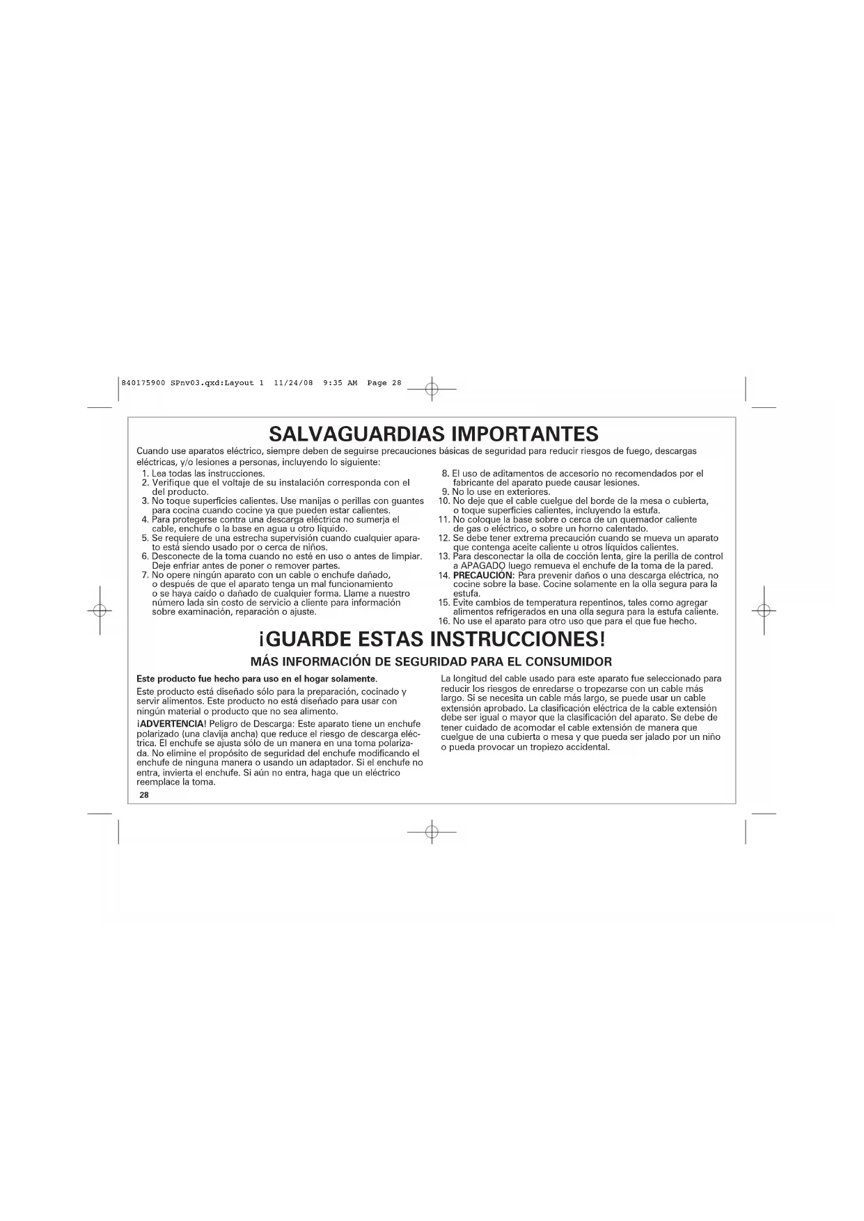 Cuando use aparatos eléctrico, siempre deben de seguirse precauciones básicas de seguridad para reducir riesgos de fuego, descargas eléctricas, y/o lesiones a personas, incluyendo lo siguiente: ¡GUARDE ESTAS INSTRUCCIONES! 840175900 SPnv03.qxd:Layout 1 11/24/08 9:35 AM Page 2829 TAPA DE VIDRIO Y OLLA SEGURA PARA LA ESTUFA: PRECAUCIONES E INFORMACIÓN
