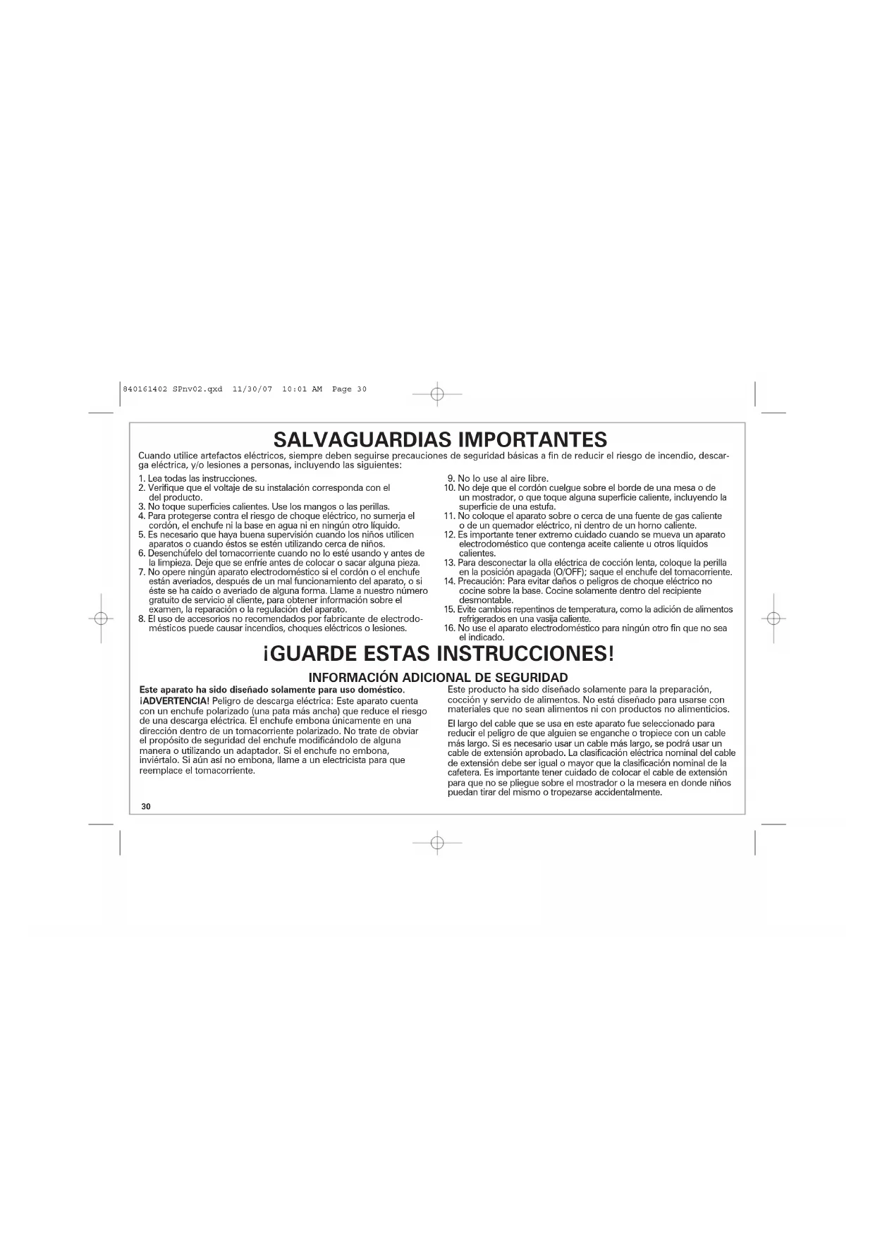 el indicado. Este aparato ha sido diseñado solamente para uso doméstico. ¡ADVERTENCIA! Peligro de descarga eléctrica: Este aparato cuenta con un enchufe polarizado (una pata más ancha) que reduce el riesgo de una descarga eléctrica. El enchufe embona únicamente en una dirección dentro de un tomacorriente polarizado. No trate de obviar el propósito de seguridad del enchufe modificándolo de alguna manera o utilizando un adaptador. Si el enchufe no embona, inviértalo. Si aún así no embona, llame a un electricista para que reemplace el tomacorriente. Este producto ha sido diseñado solamente para la preparación, cocción y servido de alimentos. No está diseñado para usarse con materiales que no sean alimentos ni con productos no alimenticios. El largo del cable que se usa en este aparato fue seleccionado para reducir el peligro de que alguien se enganche o tropiece con un cable más largo. Si es necesario usar un cable más largo, se podrá usar un cable de extensión aprobado. La clasificación eléctrica nominal del cable de extensión debe ser igual o mayor que la clasificación nominal de la cafetera. Es importante tener cuidado de colocar el cable de extensión para que no se pliegue sobre el mostrador o la mesera en donde niños puedan tirar del mismo o tropezarse accidentalmente. SALVAGUARDIAS IMPORTANTES Cuando utilice artefactos eléctricos, siempre deben seguirse precauciones de seguridad básicas a fin de reducir el riesgo de incendio, descar- ga eléctrica, y/o lesiones a personas, incluyendo las siguientes: ¡GUARDE ESTAS INSTRUCCIONES!