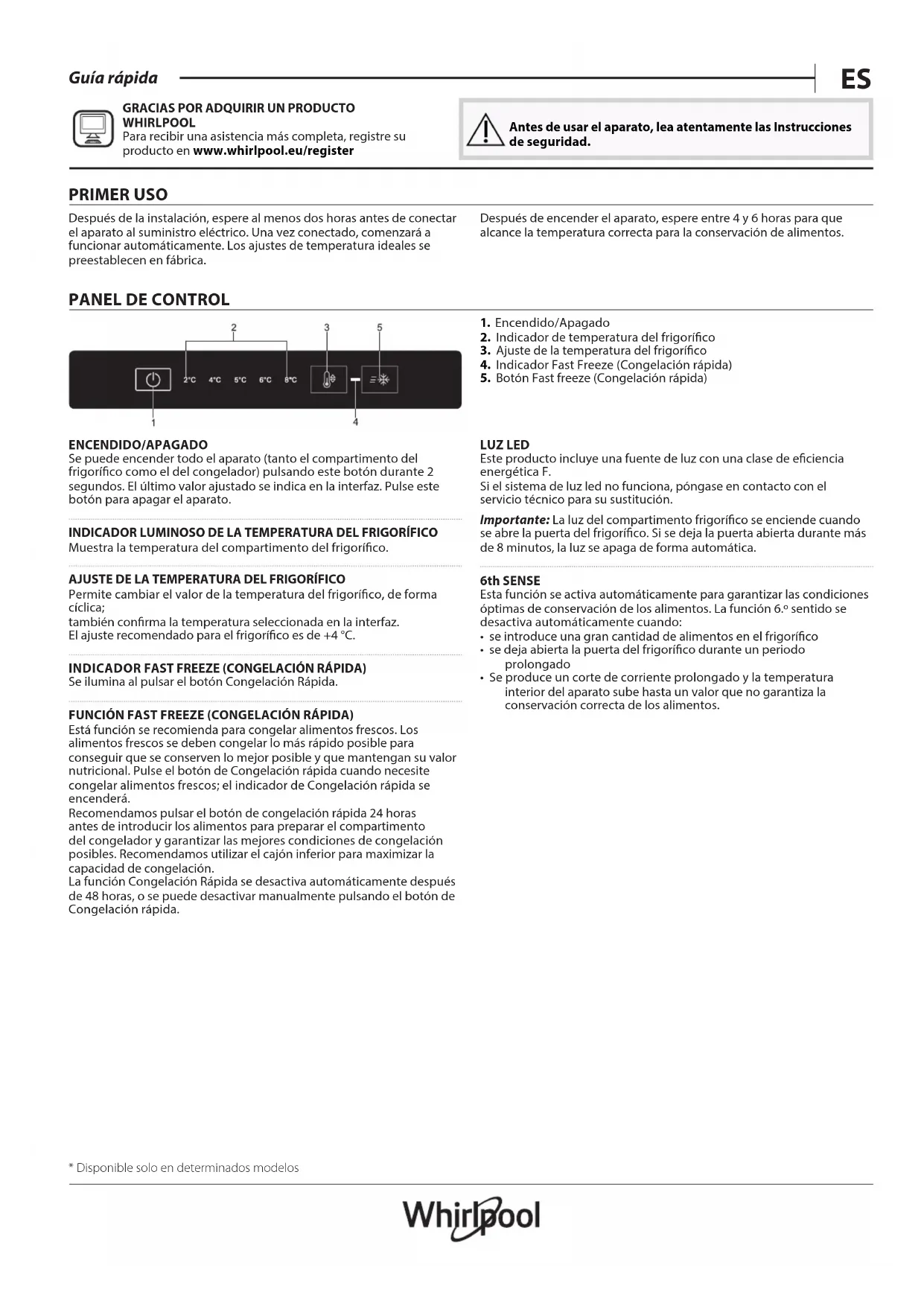 WHIRLPOOL Para recibir una asistencia más completa, registre su producto en www . whirlpool . eu/ register Antes de usar el aparato, lea atentamente las Instrucciones de seguridad. PRIMER USO Después de la instalación, espere al menos dos horas antes de conectar el aparato al suministro eléctrico. Una vez conectado, comenzará a funcionar automáticamente. Los ajustes de temperatura ideales se preestablecen en fábrica. Después de encender el aparato, espere entre 4 y 6horas para que alcance la temperatura correcta para la conservación de alimentos.