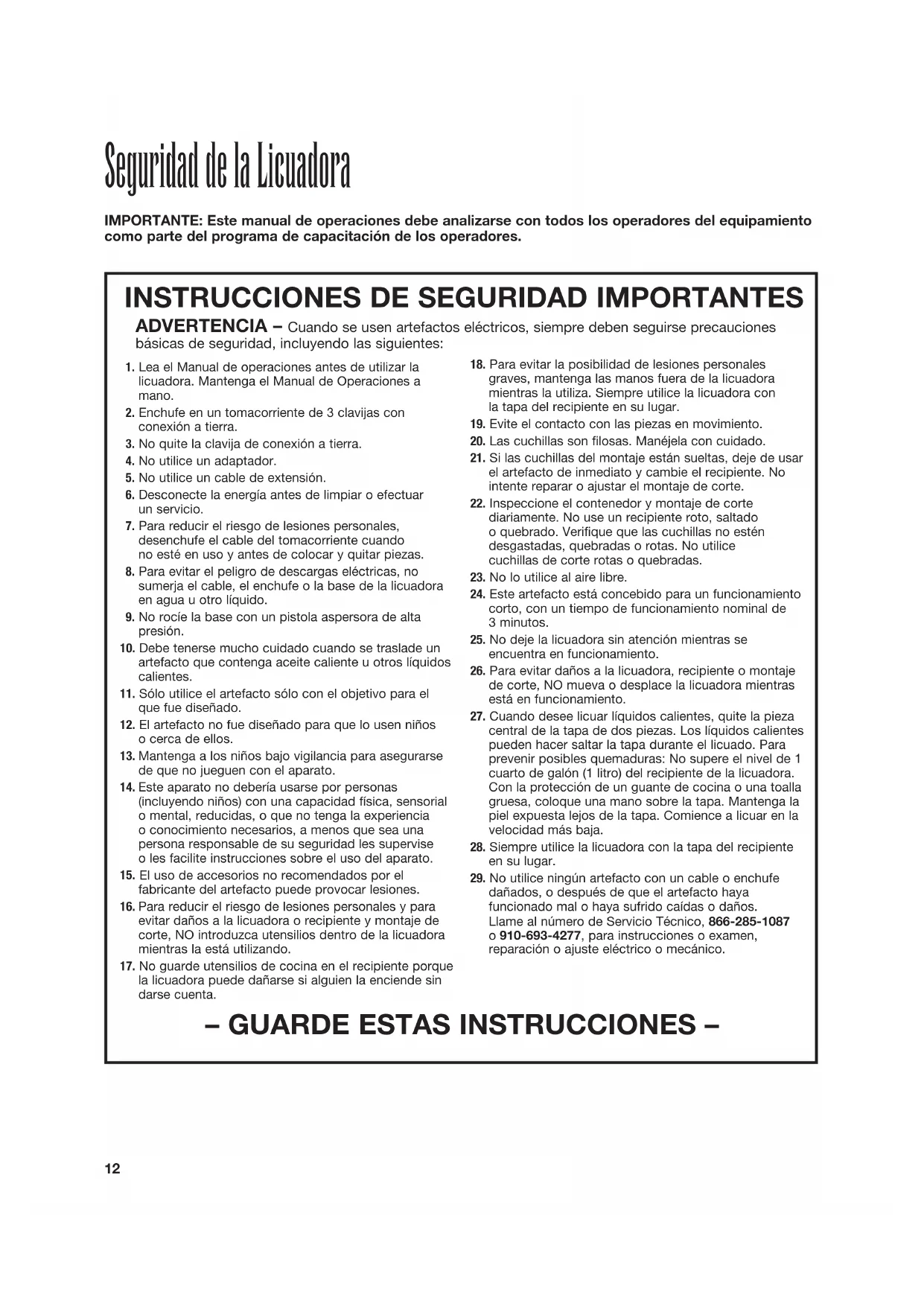 licuadora. Mantenga el Manual de Operaciones a mano.