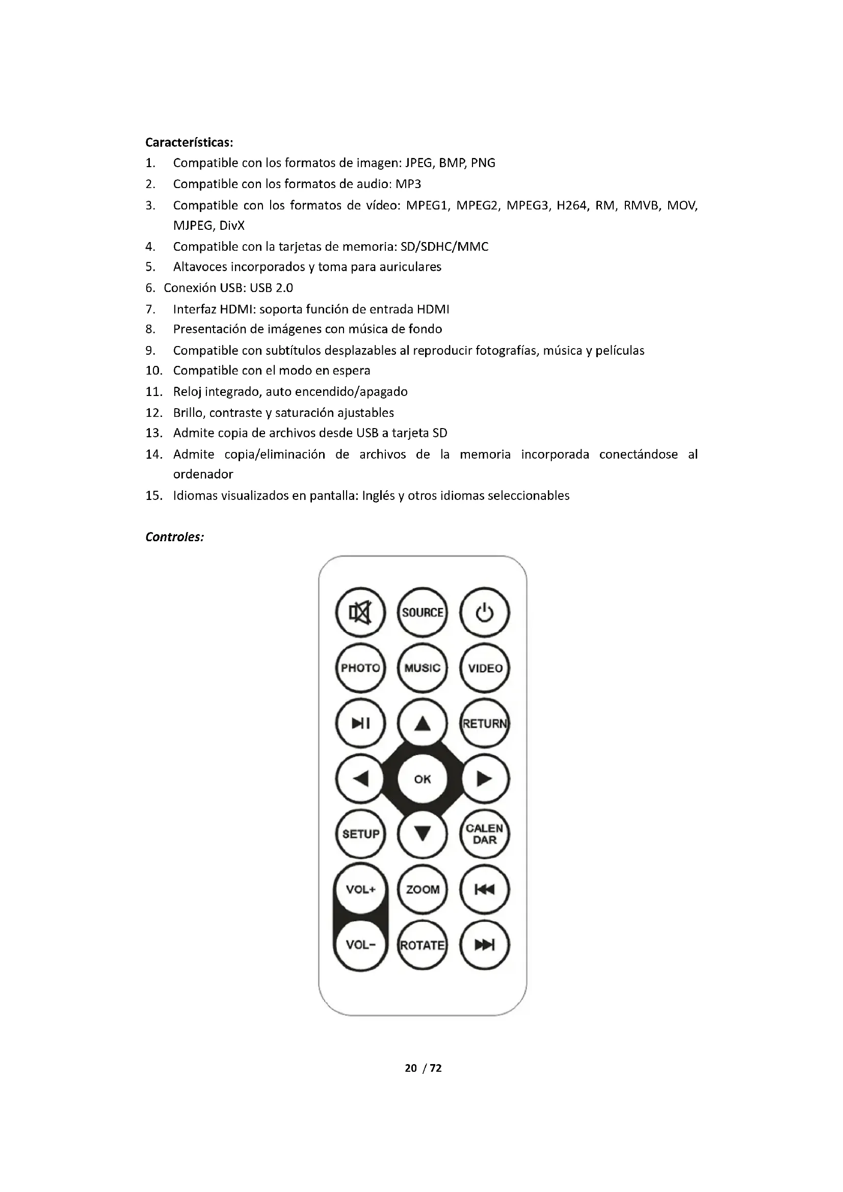 Controles:21 / 72 ENCENDIDO Enciende o apaga. SILENCIO Silencio SOURCE Entrada de señal HDMI/AV/DMP PHOTO Directamente al modo de reproducción de fotografía MUSIC Directamente al modo de reproducción de música VIDEO Directamente al modo de reproducción de vídeo