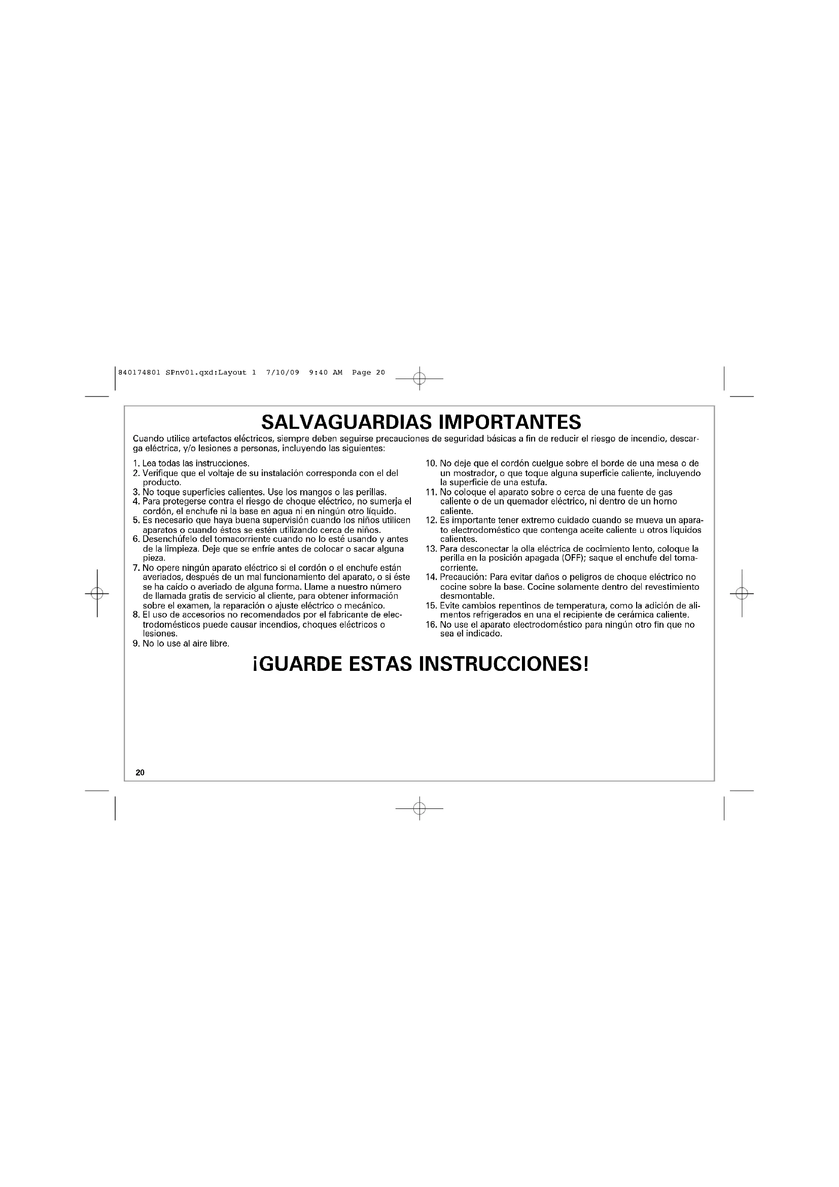 sea el indicado. Cuando utilice artefactos eléctricos, siempre deben seguirse precauciones de seguridad básicas a fin de reducir el riesgo de incendio, descar- ga eléctrica, y/o lesiones a personas, incluyendo las siguientes: ¡GUARDE ESTAS INSTRUCCIONES! 840174801 SPnv01.qxd:Layout 1 7/10/09 9:40 AM Page 2021