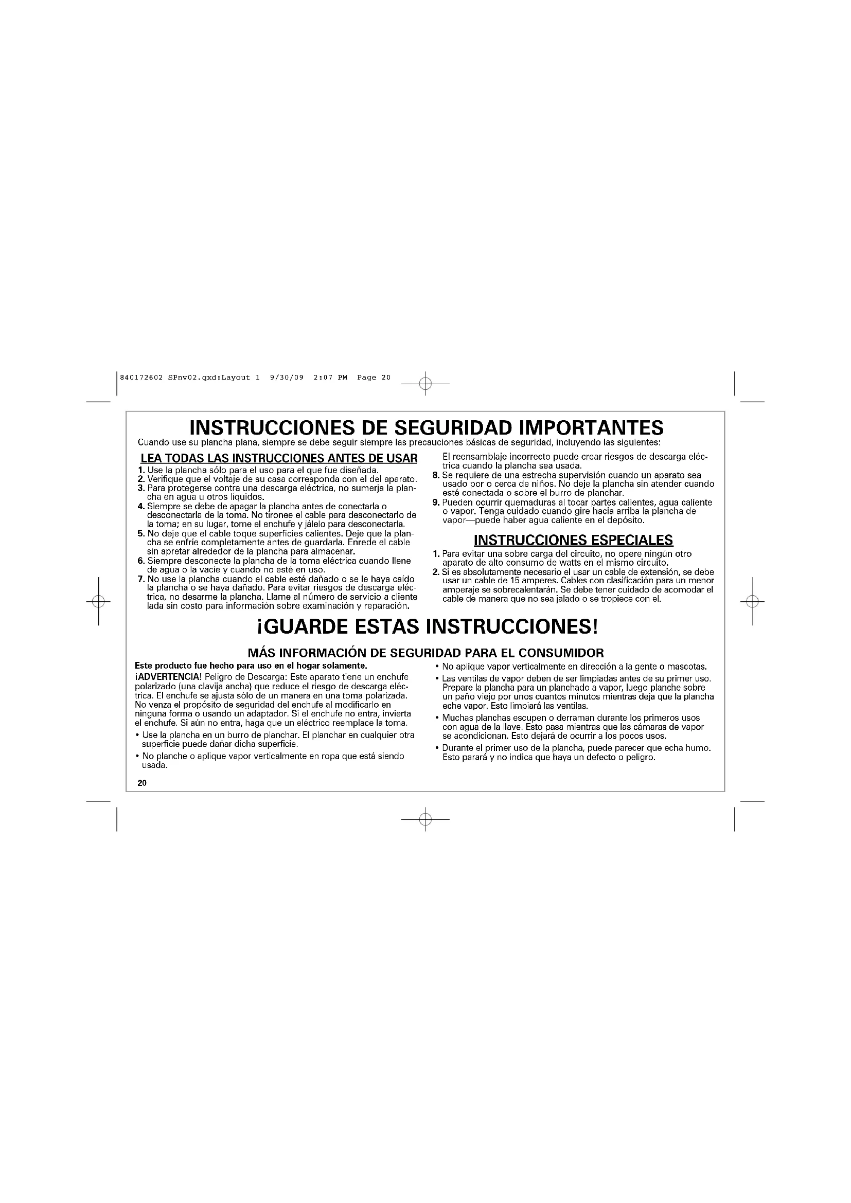 usar un cable de 15 amperes. Cables con clasificación para un menor amperaje se sobrecalentarán. Se debe tener cuidado de acomodar el cable de manera que no sea jalado o se tropiece con el. Cuando use su plancha plana, siempre se debe seguir siempre las precauciones básicas de seguridad, incluyendo las siguientes: MÁS INFORMACIÓN DE SEGURIDAD PARA EL CONSUMIDOR Este producto fue hecho para uso en el hogar solamente. ¡ADVERTENCIA! Peligro de Descarga: Este aparato tiene un enchufe polarizado (una clavija ancha) que reduce el riesgo de descarga eléc- trica. El enchufe se ajusta sólo de un manera en una toma polarizada. No venza el propósito de seguridad del enchufe al modificarlo en ninguna forma o usando un adaptador. Si el enchufe no entra, invierta el enchufe. Si aún no entra, haga que un eléctrico reemplace la toma.