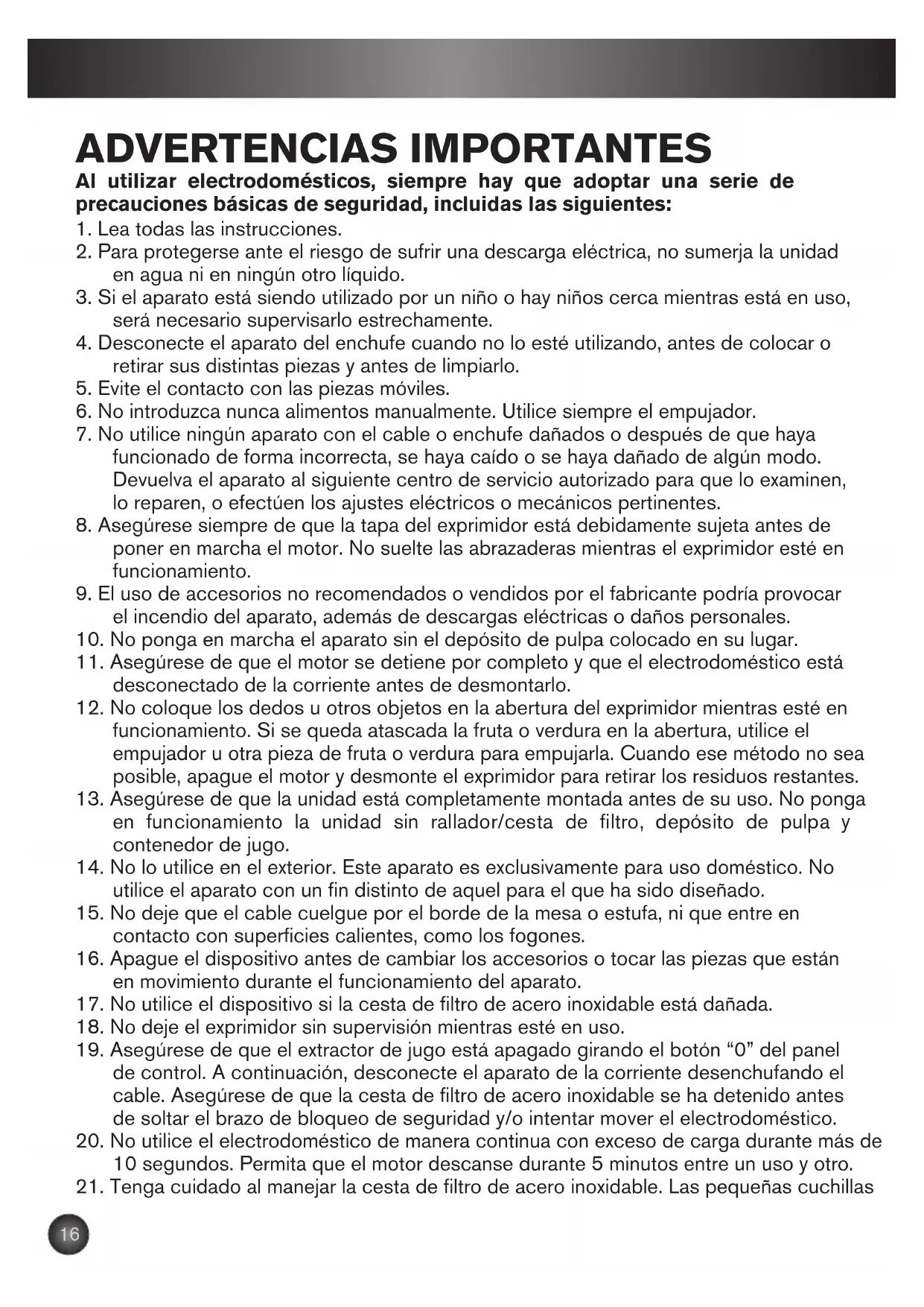 18. No deje el exprimidor sin supervisión mientras esté en uso.