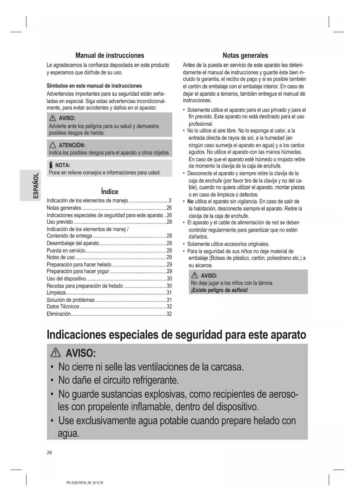 - Recetas para preparación de helado p. 30