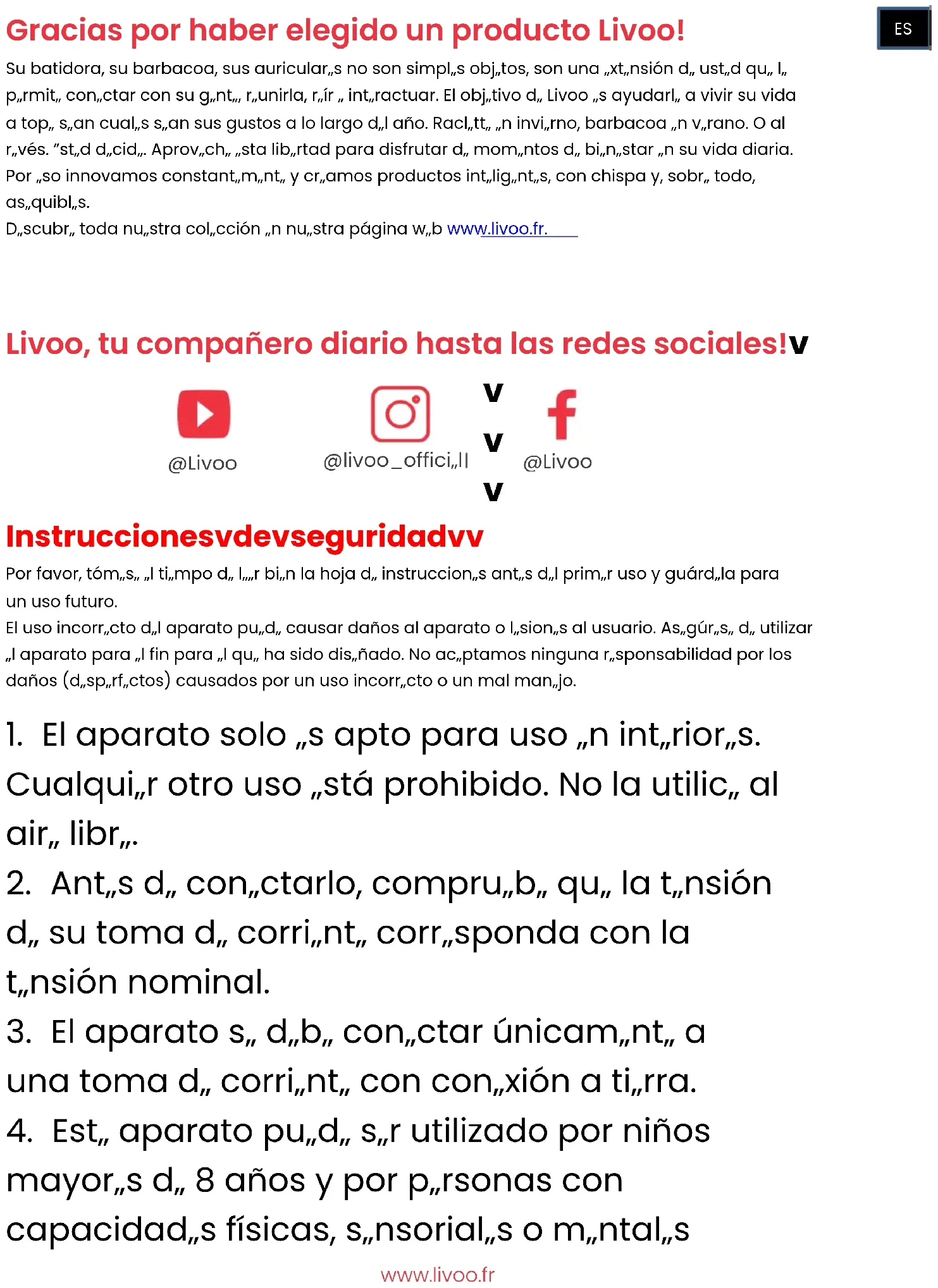 ----------------------------------------------------------------------------------------------www.livoo.fr Gracias por haber elegido un producto Livoo! Su batidora, su barbacoa, sus auriculares no son simples objetos, son una extensión de usted que le permite conectar con su gente, reunirla, reír e interactuar. El objetivo de Livoo es ayudarle a vivir su vida a tope sean cuales sean sus gustos a lo largo del año. Raclette en invierno, barbacoa en verano. O al revés. Usted decide. Aproveche esta libertad para disfrutar de momentos de bienestar en su vida diaria. Por eso innovamos constantemente y creamos productos inteligentes, con chispa y, sobre todo, asequibles. Descubre toda nuestra colección en nuestra página web www.livoo.fr.