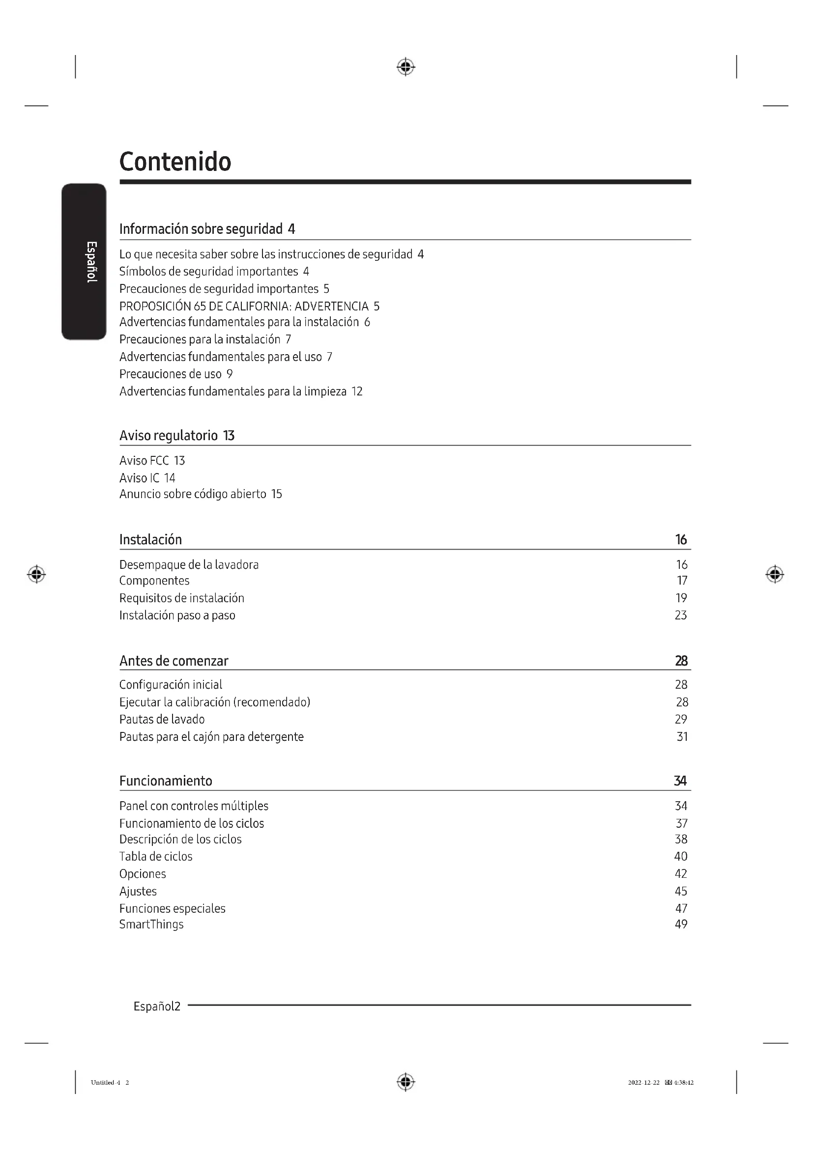 Advertencias fundamentales para la instalación 6 Precauciones para la instalación 7 Advertencias fundamentales para el uso 7 Precauciones de uso 9 Advertencias fundamentales para la limpieza 12 Aviso regulatorio 13 Aviso FCC 13 Aviso IC 14 Anuncio sobre código abierto 15 Instalación 16 Desempaque de la lavadora 16 Componentes 17 Requisitos de instalación 19 Instalación paso a paso 23 Antes de comenzar 28 Conguración inicial 28 Ejecutar la calibración (recomendado) 28 Pautas de lavado 29 Pautas para el cajón para detergente 31 Funcionamiento 34 Panel con controles múltiples 34 Funcionamiento de los ciclos 37 Descripción de los ciclos 38 Tabla de ciclos 40 Opciones 42 Ajustes 45 Funciones especiales 47 SmartThings 49 Untitled-4 2 2022-12-22 4:38:42Español Español 3 Mantenimiento 50 Limpiar+ 50 Drenaje de emergencia 51 Limpieza 52 Recuperación de un congelamiento 56 Mantenimiento luego de un período prolongado sin utilizar la lavadora 56 Limpieza del exterior 57 Limpieza del interior 57 Solución de problemas 58 Vericaciones 58 Códigos de información 64 Especicaciones 66 Tabla de indicaciones sobre telas 66 Protección del medio ambiente 67 Declaración de conformidad 67 Hoja de especicaciones 68 Untitled-4 3 2022-12-22 4:38:42Español