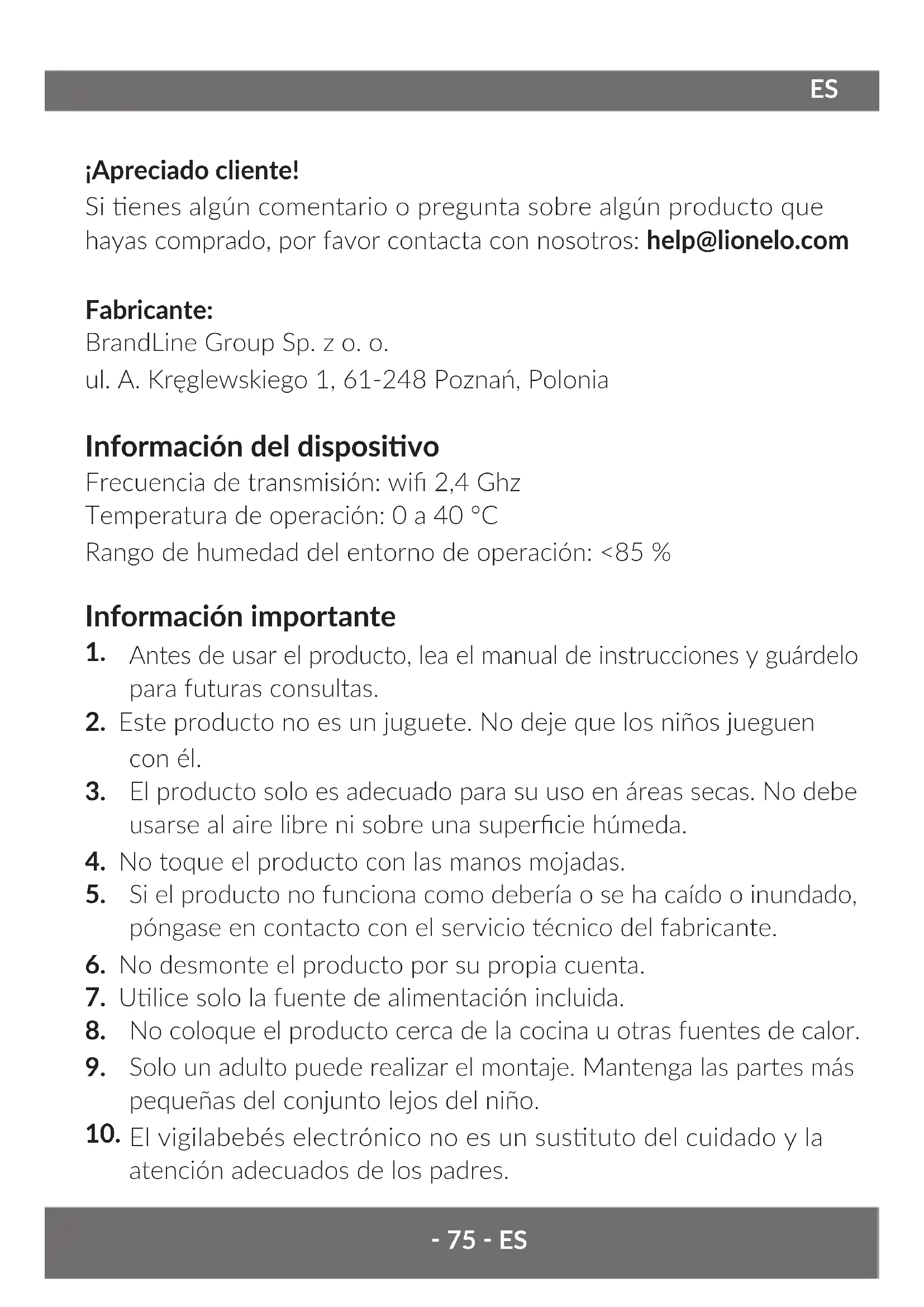 ¡Apreciado cliente! Si enes algún comentario o pregunta sobre algún producto que hayas comprado, por favor contacta con nosotros: help@lionelo.com Fabricante: BrandLine Group Sp. z o. o. ul. A. Kręglewskiego 1, 61-248 Poznań, Polonia Información del disposivo Frecuencia de transmisión: wi 2,4 Ghz Temperatura de operación: 0 a 40 °C Rango de humedad del entorno de operación: <85 % Información importante