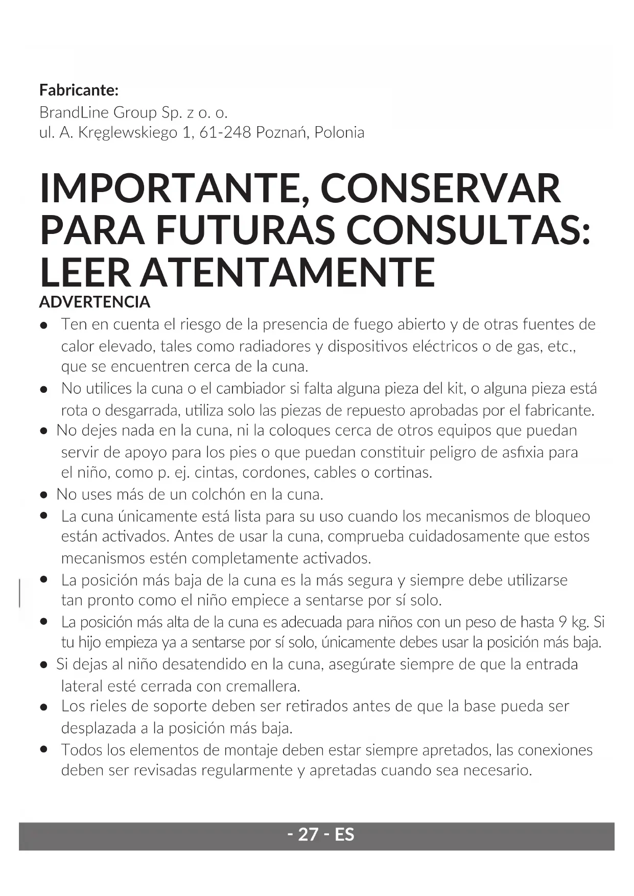 ¡Apreciado cliente! Si enes algún comentario o pregunta sobre algún producto que hayas comprado, por favor contacta con nosotros: help@lionelo.com ¡ATENCIÓN! EL MONTAJE DEBE SER LLEVADO A CABO POR UN ADULTO. El incumplimiento de estas advertencias e instrucciones de montaje puede provocar lesiones graves o la muerte.‑ 27 ‑ ES Fabricante: BrandLine Group Sp. z o. o. ul. A. Kręglewskiego 1, 61-248 Poznań, Polonia IMPORTANTE, CONSERVAR PARA FUTURAS CONSULTAS: LEER ATENTAMENTE ADVERTENCIA