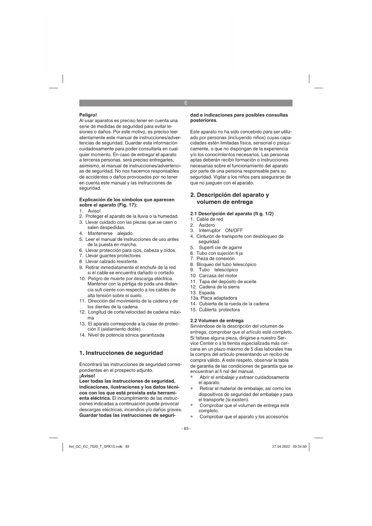 Durante el almacenamiento o el transporte, utilizar las cubiertas de protección adjuntas para la cadena/espada de la sierra. Anl_GC_EC_7520_T_SPK13.indb 89Anl_GC_EC_7520_T_SPK13.indb 89 27.04.2022 09:34:5227.04.2022 09:34:52E