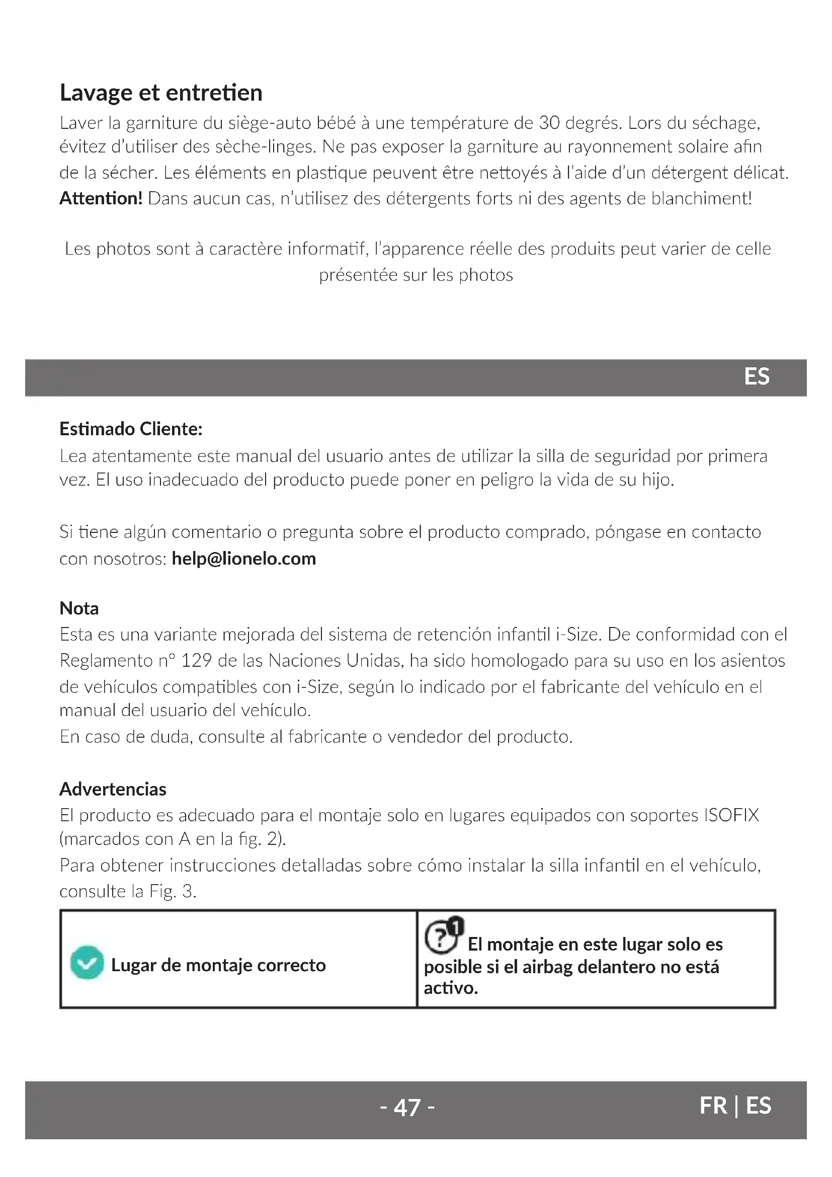 PROTECTION LATÉRALE (g. 21) Lorsque le siège-auto est installé dans la voiture, sortez toujours la protecon latérale de la porte de la voiture.‑ 47 ‑ Lavage et entreen Laver la garniture du siège-auto bébé à une température de 30 degrés. Lors du séchage, évitez d’uliser des sèche-linges. Ne pas exposer la garniture au rayonnement solaire an de la sécher. Les éléments en plasque peuvent être neoyés à l’aide d’un détergent délicat. Aenon! Dans aucun cas, n’ulisez des détergents forts ni des agents de blanchiment! Les photos sont à caractère informaf, l’apparence réelle des produits peut varier de celle présentée sur les photos Esmado Cliente: Lea atentamente este manual del usuario antes de ulizar la silla de seguridad por primera vez. El uso inadecuado del producto puede poner en peligro la vida de su hijo. Si ene algún comentario o pregunta sobre el producto comprado, póngase en contacto con nosotros: help@lionelo.com Nota Esta es una variante mejorada del sistema de retención infanl i-Size. De conformidad con el Reglamento nº 129 de las Naciones Unidas, ha sido homologado para su uso en los asientos de vehículos compables con i-Size, según lo indicado por el fabricante del vehículo en el manual del usuario del vehículo. En caso de duda, consulte al fabricante o vendedor del producto. Advertencias El producto es adecuado para el montaje solo en lugares equipados con soportes ISOFIX (marcados con A en la g. 2). Para obtener instrucciones detalladas sobre cómo instalar la silla infanl en el vehículo, consulte la Fig. 3. Lugar de montaje correcto El montaje en este lugar solo es posible si el airbag delantero no está acvo.