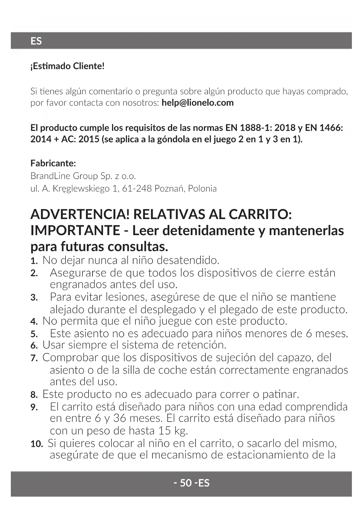 Il convient de ne pas uliser d’agents chimiques forts au neoyage du présent produit. Les photos sont à caractère informaf, l’apparence réelle des produits peut varier de celle présentée sur les photos.‑ 50 ‑ES ¡Esmado Cliente! Si enes algún comentario o pregunta sobre algún producto que hayas comprado, por favor contacta con nosotros: help@lionelo.com El producto cumple los requisitos de las normas EN 1888-1: 2018 y EN 1466: 2014 + AC: 2015 (se aplica a la góndola en el juego 2 en 1 y 3 en 1). Fabricante: BrandLine Group Sp. z o.o. ul. A. Kręglewskiego 1, 61-248 Poznań, Polonia ADVERTENCIA! RELATIVAS AL CARRITO: IMPORTANTE - Leer detenidamente y mantenerlas para futuras consultas.