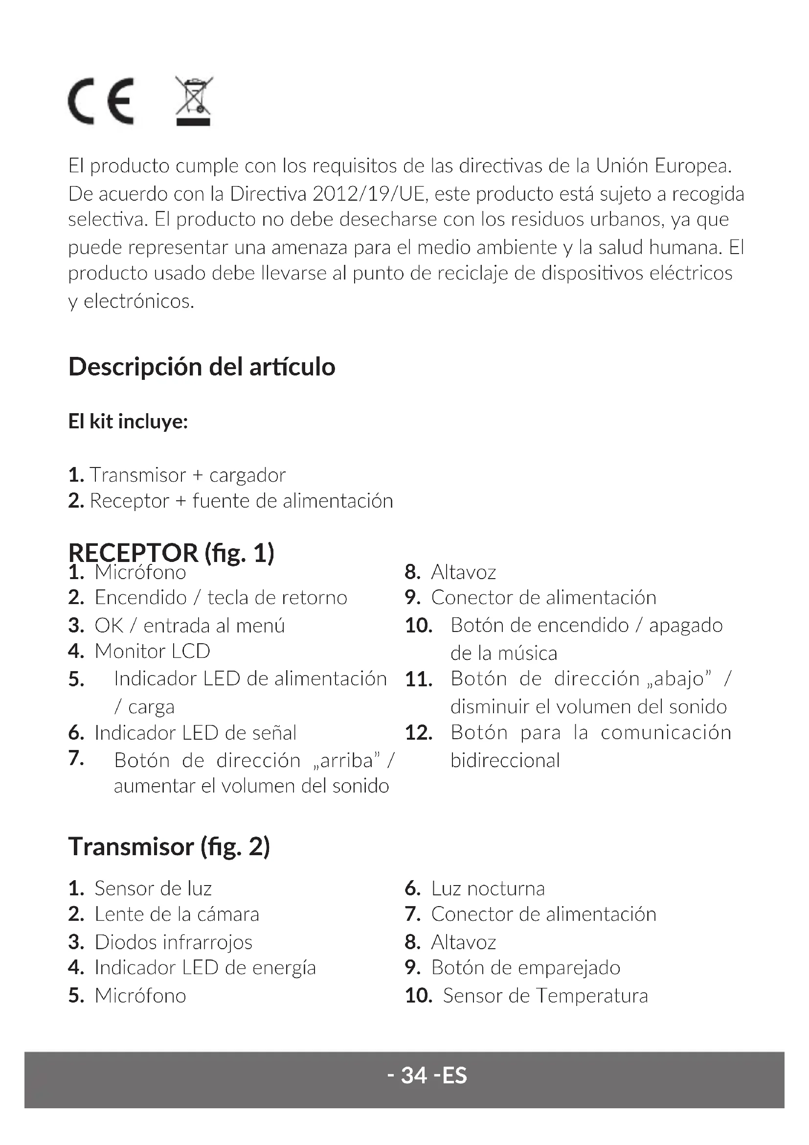 Uliza los botones direccionales para seleccionar la opción que te interese. Presionando el botón OK (3) accederás al menú, mientras que retorno (2) te permirá volver al módulo anterior. Para una selección detallada de los parámetros, se utiliza el botón de comunicación bidireccional para seleccionar el parámetro y las echas arriba y abajo para modicarlo. VOX (g. 14) Aquí puedes cambiar el modo de funcionamiento del disposivo entre: Normal pantalla retroiluminada VOX: modo de nocación y ahorro de energía Puedes elegir la sensibilidad de la detección de sonido del disposivo en el modo VOX: baja, media o alta. Emparejado de la cámara (g. 8) Accede al menú principal y selecciona la función „cámara” (1), mantén pulsado el botón de emparejado de la cámara (9) durante 10 segundos. Ajustes de las alarmas (g. 9) Para ajustar o modicar la alarma, selecciona un elemento de la lista. Podrás seleccionar si una determinada alarma está acva, modicar la hora de la alarma y el modo de repeción (una vez, todos los días o en los días de la semana seleccionados) Ajustes Hora y fecha (g. 10) Aquí puedes cambiar la fecha y la hora, así como el formato de la fecha. Unidad de temperatura (g. 11) Formatos de temperatura disponibles: grados cengrados o Fahrenheit. Reducción del ruido de la imagen (g. 12)