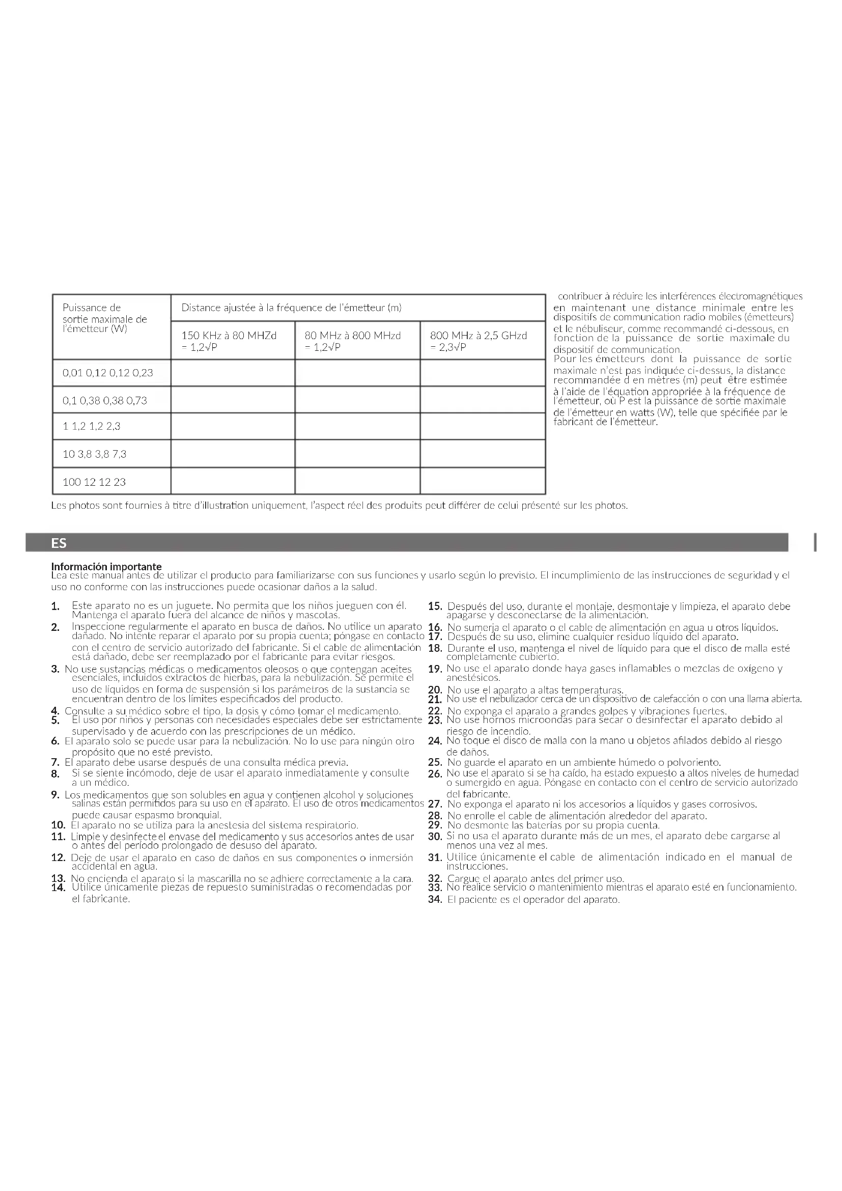 No es posible determinar con precisión la intensidad del campo a parr de transmisores jos, como estaciones base para radiotelefonía (móvil / inalámbrica), transmisores de radio terrestres móviles de acionados, transmisores de radio AM y FM y transmisores de televisión. Para determinar las condiciones electromagnécas asociadas a los radiotransmisores jos, se deben realizar mediciones de interferencias electromagnécas en una ubicación dada. Si la intensidad de campo medida en el lugar donde se uliza el nebulizador excede el nivel de cumplimiento aplicable indicado anteriormente, se deben hacer observaciones del nebulizador para vericar el funcionamiento correcto. Si se observa funcionamiento anormal, pueden ser necesarias medidas adicionales, como el cambio de posición o de lugar del nebulizador.