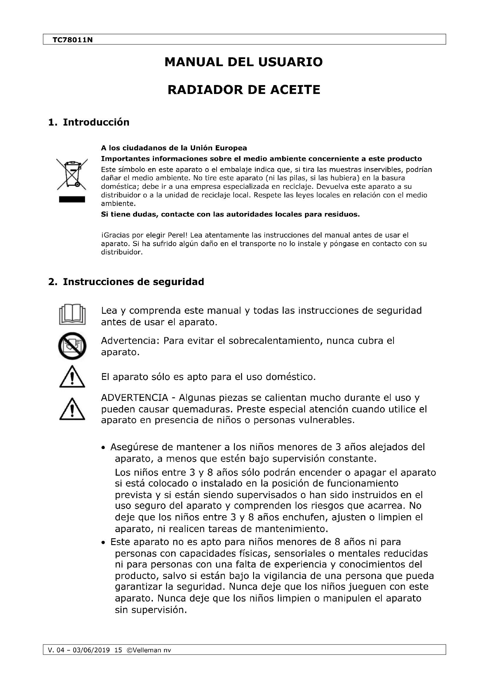 Este aparato no es apto para niños menores de 8 años ni para personas con capacidades físicas, sensoriales o mentales reducidas ni para personas con una falta de experiencia y conocimientos del producto, salvo si están bajo la vigilancia de una persona que pueda garantizar la seguridad. Nunca deje que los niños jueguen con este aparato. Nunca deje que los niños limpien o manipulen el aparato sin supervisión.TC78011N