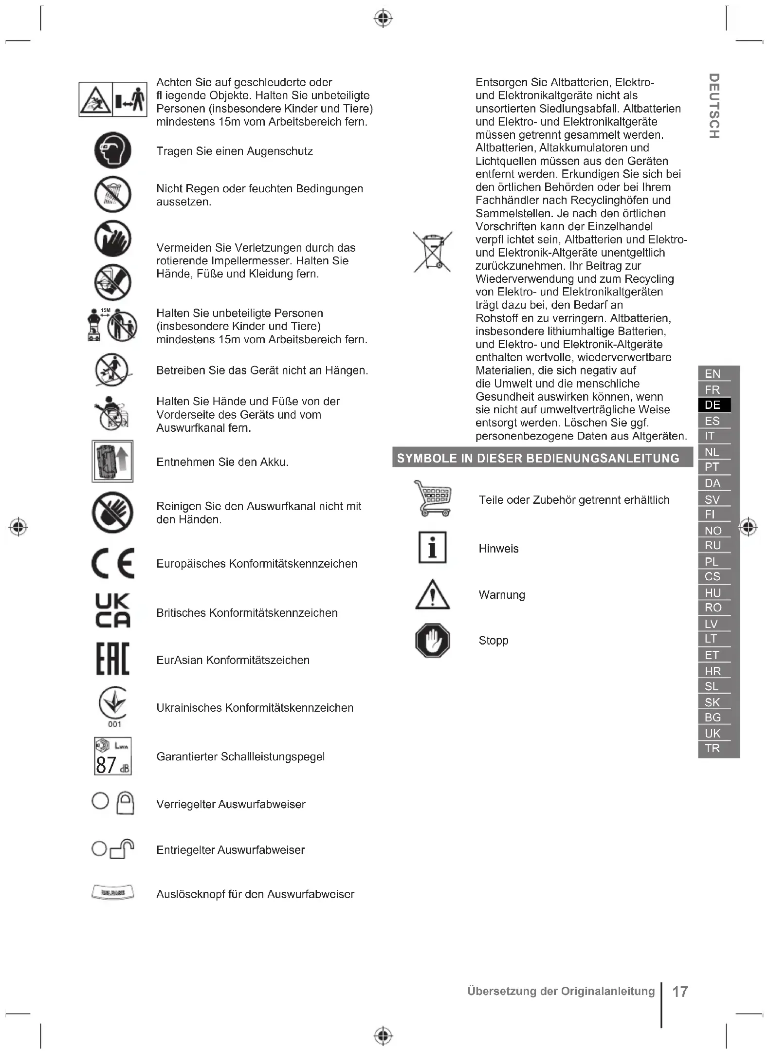 TR■ Desembrague por completo la unidad y póngala en punto muerto antes de proceder al arranque del motor. ■ Mientras opera la máquina, lleve siempre vestimenta adecuada para el invierno y calzado antideslizante de seguridad. Evite llevar ropa suelta, con cordones o corbata, ya que podría engancharse en las partes móviles. ■ Recoja el cabello largo para que quede por encima del nivel de los hombros y evitar así que se enmarañe en cualquier pieza móvil. ■ Utilice siempre gafas de seguridad o protecciones oculares durante el uso del producto, o cuando realice un ajuste o reparación, para proteger los ojos de los objetos extraños que puedan salir despedidos del producto. ■ Antes de cada uso, asegúrese de que todos los controles y dispositivos de seguridad funcionan correctamente. No utilice el producto si el interruptor de apagado no detiene el funcionamiento del producto. ■ Antes de cada uso, compruebe siempre que la carcasa no esté dañada y que las protecciones y las asas estén en su posición y bien fijadas. UTILIZACIÓN ■ No utilice el aparato cuando haya riesgo de relámpago. ■ No coloque las manos o los pies cerca o debajo de las piezas giratorias. Manténgase alejado de la apertura de descarga en todo momento. No coloque ningún objeto en las aberturas. ■ Extreme las precauciones cuando utilice el producto sobre caminos o senderos de grava. Permanezca alerta ante cualquier peligro oculto o cuando trabaje cerca de carreteras públicas. ■ Para reducir el riesgo de lesión asociado con el contacto con las piezas móviles, apague siempre el producto y extraiga la batería. Asegúrese de que todas las partes móviles se han detenido por completo: ● después de golpear un objeto extraño para inspeccionar el aparato y ver si está dañado ● antes de limpiar o despejar una obstrucción ● antes de dejar el producto sin vigilancia ● antes de inspeccionar, mantener o trabajar con el producto ● si el producto empieza a vibrar de forma anormal (comprobar inmediatamente) La vibración generalmente es una advertencia de problemas. ■ Utilice el aparato en la superficie de cuestas, nunca hacia arriba ni abajo Tenga mucho cuidado cuando cambie de dirección en las cuestas. No intente limpiar una pendiente pronunciada. ■ Nunca utilice el aparato sin haber colocado la protección, las placas u otro tipo de dispositivo de seguridad pertinente. ■ No dirija nunca la salida de descarga hacia otras personas o zonas donde puedan producirse daños materiales. Mantenga a los espectadores fuera del área de trabajo, especialmente niños y mascotas. ■ No sobrecargue la capacidad de la máquina intentando quitar la nieve con demasiada rapidez. ■ Nunca utilice el producto a velocidades de transporte elevadas en superficies resbaladizas. Mire hacia atrás y extreme las precauciones cuando utilice el producto en marcha atrás. ■ Desconecte la alimentación que llega al colector/ impulsor cuando vaya a transportar el producto o cuando no lo vaya a utilizar. ■ Utilice sólo piezas y accesorios de recambio originales del fabricante. ■ No utilice nunca el producto sin una visibilidad o iluminación adecuadas. Asegúrese de mantener siempre una posición adecuada y sujete con fuerza las empuñaduras. Camine, nunca corra. ■ Nunca coloque el aparato en ninguna superficie, que no sea una superficie dura y limpia, cuando el motor esté en funcionamiento. La gravilla, la arena y otros restos pueden ser arrastrados por el chorro de aire y disparados hacia el operador o los transeúntes, provocando lesiones graves. ■ Nunca opere el aparato cerca de recintos cerrados de cristal, automóviles, ventanas o portales sin haber ajustado correctamente el ángulo de descarga de nieve. ■ Si se le cae el producto, sufre un impacto fuerte o empieza a vibrar de manera extraña, apáguelo inmediatamente y analice los daños para identificar la causa de la vibración. La reparación de daños y la sustitución de piezas deben ser realizadas por un centro de servicio autorizado. ■ Utilice el producto únicamente a temperaturas comprendidas entre 0 °C y 40 °C. ■ Guarde el producto en un lugar donde la temperatura ambiente esté comprendida entre 0 °C y 40 °C. ADVERTENCIAS DE SEGURIDAD DE LA BATERÍA ADICIONAL ■ Para reducir el riesgo de incendio, lesiones personales y daños al producto provocados por un cortocircuito, nunca sumerja el producto, la batería o el cargador en líquido, ni permita que un líquido fluya por su interior. Los fluidos corrosivos o conductivos, como el agua de mar, ciertos productos quími-cos industriales y blanqueadores o lejías que contienen, etc., Pueden causar un cortocircuito. ■ Cargue la batería en un lugar donde la temperatura ambiente esté comprendida entre 10 °C y 38 °C. ■ Guarde la batería en un lugar donde la temperatura ambiente esté comprendida entre 0 °C y 20°C. ■ Utilice la batería en un lugar donde la temperatura ambiente esté comprendida entre 0 °C y 40 °C.