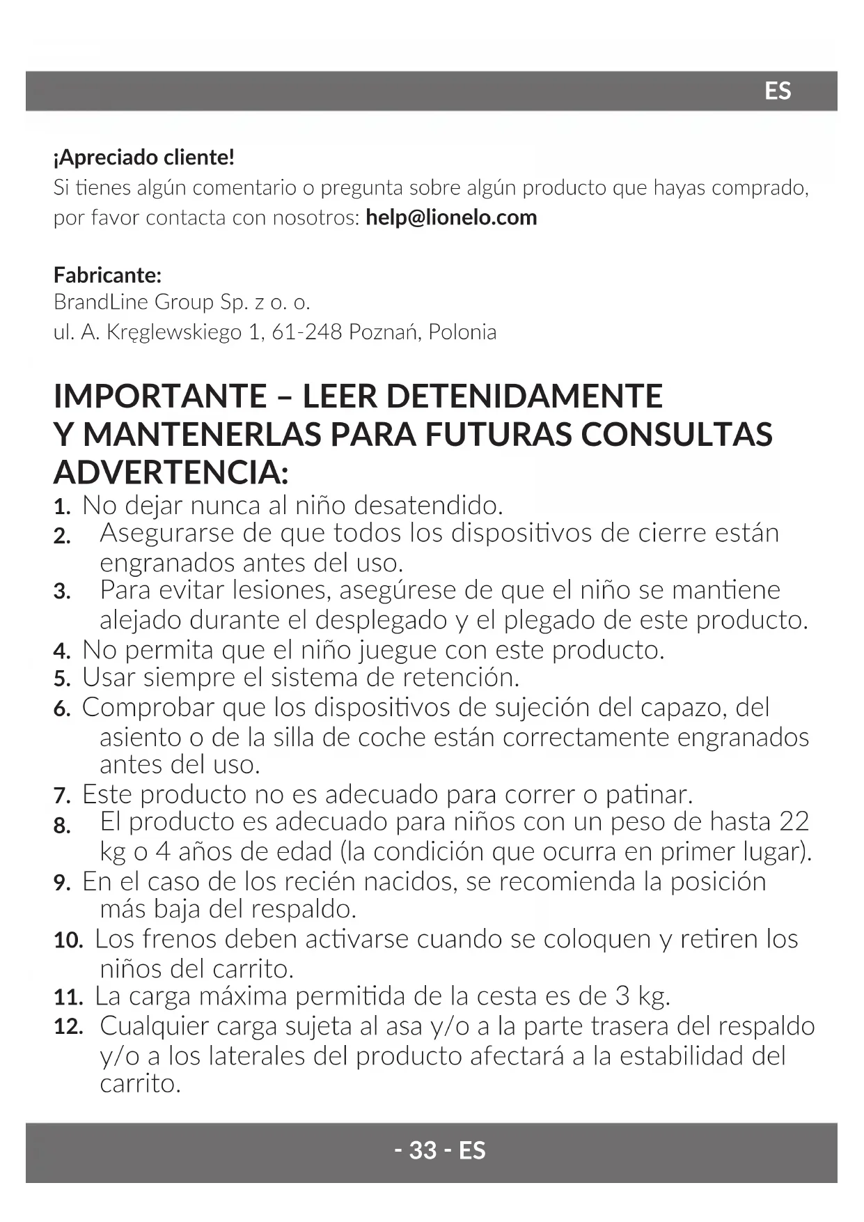 - No ulices detergentes fuertes. El producto cumple los requisitos de las siguientes normas: EN 1888-1:2019, EN 1888-2:2019 Las imágenes únicamente enen un n ilustravo, el aspecto real de los productos puede diferir del que se muestra en las imágenes. Beste Klant! Als u opmerkingen of vragen hee over een gekocht product, neem dan contact met ons op: help@lionelo.com Fabrikant: BrandLine Group Sp. z o.o. A. Kręglewskiego 1, 61-248 Poznań, Polen