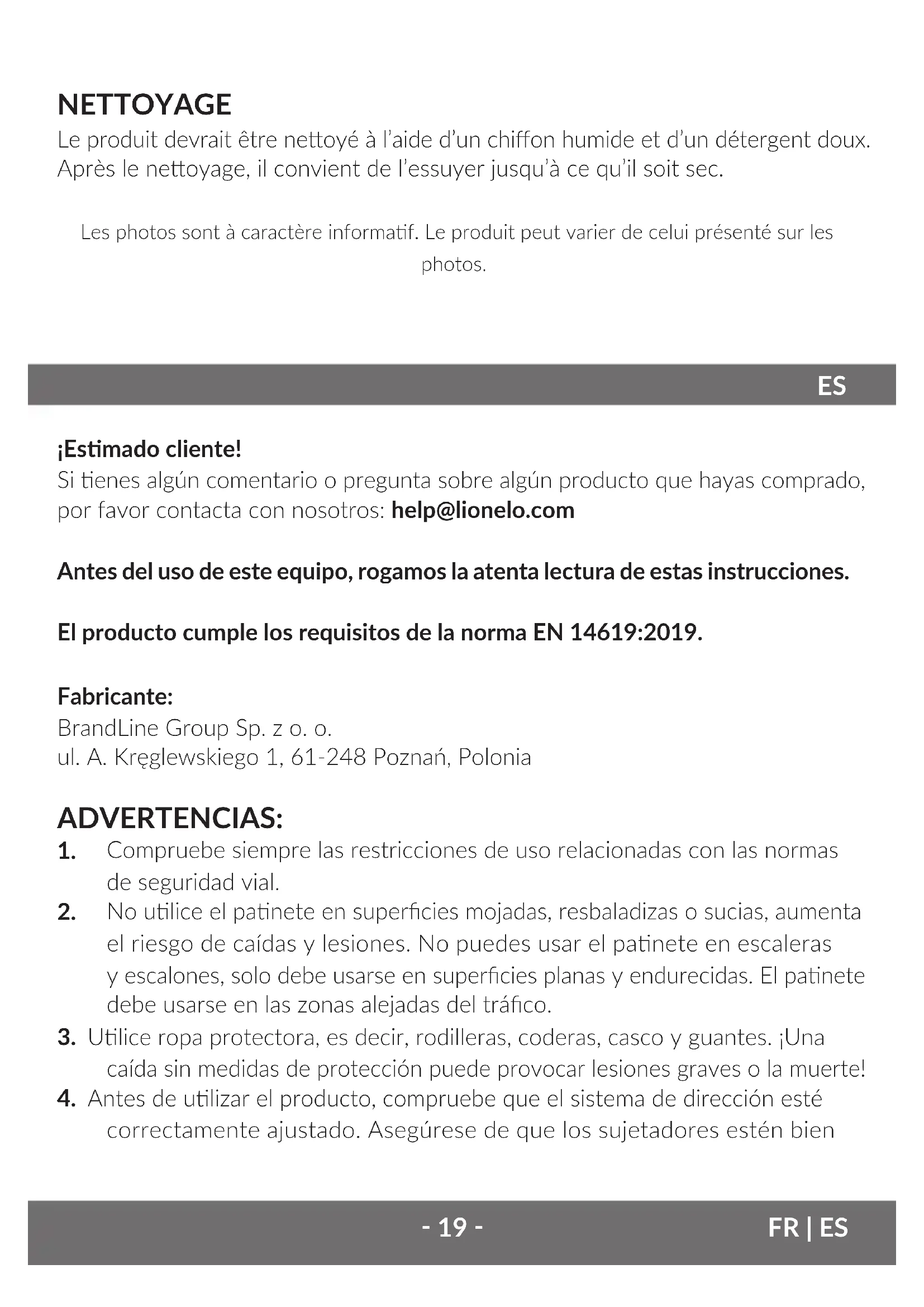 ¡Esmado cliente! Si enes algún comentario o pregunta sobre algún producto que hayas comprado, por favor contacta con nosotros: help@lionelo.com Antes del uso de este equipo, rogamos la atenta lectura de estas instrucciones. El producto cumple los requisitos de la norma EN 14619:2019. Fabricante: BrandLine Group Sp. z o. o. ul. A. Kręglewskiego 1, 61-248 Poznań, Polonia ADVERTENCIAS: