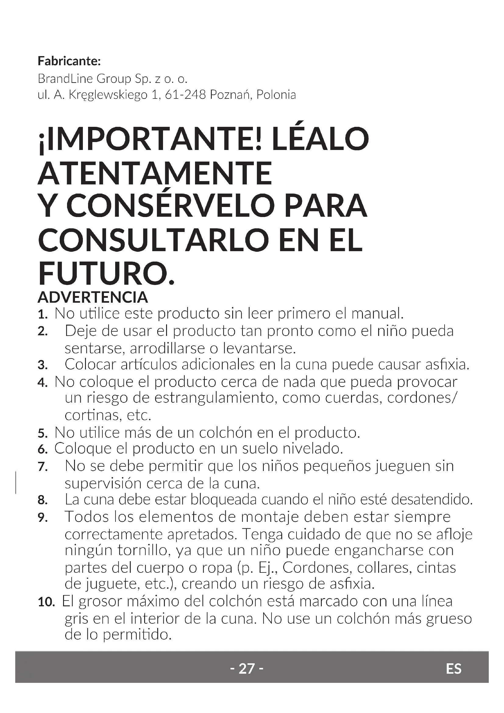 gris en el interior de la cuna. No use un colchón más grueso de lo permido.‑ 28 ‑