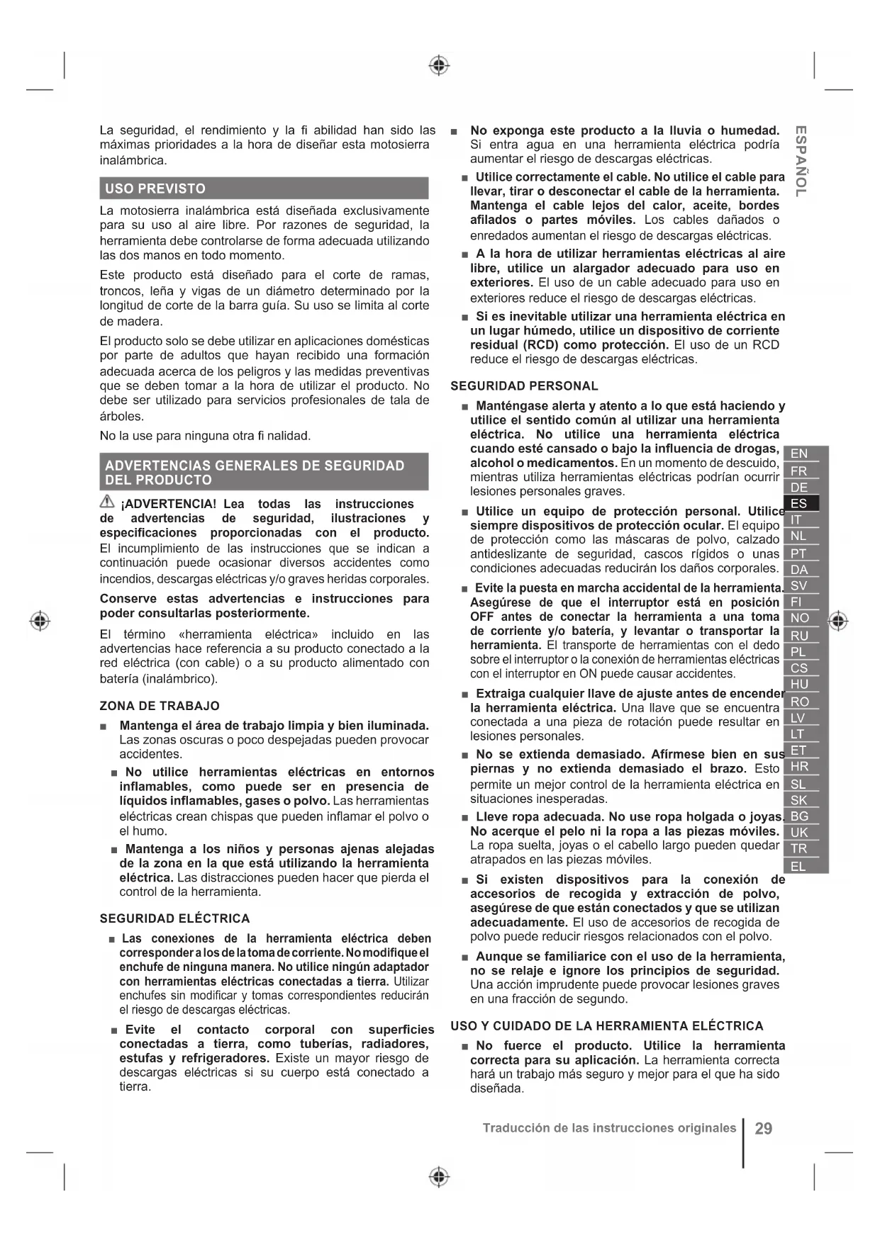 ■ Debe asistir a un curso de seguridad organizado profesionalmente sobre uso, medidas preventivas, primeros auxilios y mantenimiento de motosierras. Guarde las instrucciones para usarlas en el futuro. ■ Las motosierras son herramientas potencialmente peligrosas. Los accidentes que impliquen el uso de motosierras a menudo pueden causar la pérdida de miembros o la muerte. Las ramas que caen, el derribo de árboles, o troncos rodantes pueden causar la muerte. La madera enferma o podrida implica peligros adicionales. Debes evaluar tu capacidad para completar la tarea de manera segura. En caso de duda, déjelo en manos de un profesional de árboles. ■ No corte vides y/o maleza pequeña (menos de 75 mm de diámetro). ■ Se recomienda practicar cortando troncos sobre un caballete o base de serrado cuando se utilice el producto por primera vez. ■ La extensión de la zona de trabajo depende de la tarea realizada así como del tamaño del árbol o de la pieza en cuestión. Por ejemplo, la tala de un árbol requiere una mayor área de trabajo que la realización de otros cortes, por ejemplo, cortes de división de troncos, etc. El operario tiene que estar atento y tener bajo control todo lo que ocurre en esta área de trabajo. ■ No corte con su cuerpo en línea con la barra de guía y la cadena. Si experimenta un rebote, esta posición evitará que la cadena entre en contacto con su cabeza o cuerpo. ■ No sierre desplazando la motosierra hacia delante y hacia atrás. Deje que la cadena realice el trabajo. Mantenga la cadena afilada y no intente ejercer presión sobre ella en la zona de corte. ■ No aplique presión sobre la sierra al final del corte. Prepárese para aguantar el peso de la sierra cuando ésta sobrepase la madera. De otro modo, podría sufrir lesiones personales graves. ■ No detenga la sierra en medio de una operación de corte. Mantenga la sierra funcionando hasta que ya esté retirada del corte. ■ Para reducir el riesgo de lesión asociado con el contacto con las piezas móviles, apague siempre el producto, accione el freno de la cadena, extraiga la batería y asegúrese de que todas las piezas móviles se hayan detenido por completo. ● antes de limpiar o despejar una obstrucción ● antes de dejar el producto sin vigilancia ● antes de colocar o quitar accesorios. ● antes de inspeccionar, mantener o trabajar con el producto ■ El uso prolongado de una herramienta puede causar o agravar lesiones. Si utiliza el producto durante periodos de tiempo prolongados, asegúrese de realizar pausas de forma periódica.32 Traducción de las instrucciones originales ■ Si el aparato se cae, sufre un impacto fuerte o empieza a vibrar de manera anormal, párelo inmediatamente y compruebe si está dañado o identifique el motivo de la vibración. La reparación de daños y la sustitución de piezas deben ser realizadas por un centro de servicio autorizado. ■ Utilice el producto únicamente a temperaturas comprendidas entre 0 °C y 40 °C. ■ Guarde el producto en un lugar donde la temperatura ambiente esté comprendida entre -10 °C y 50 °C.