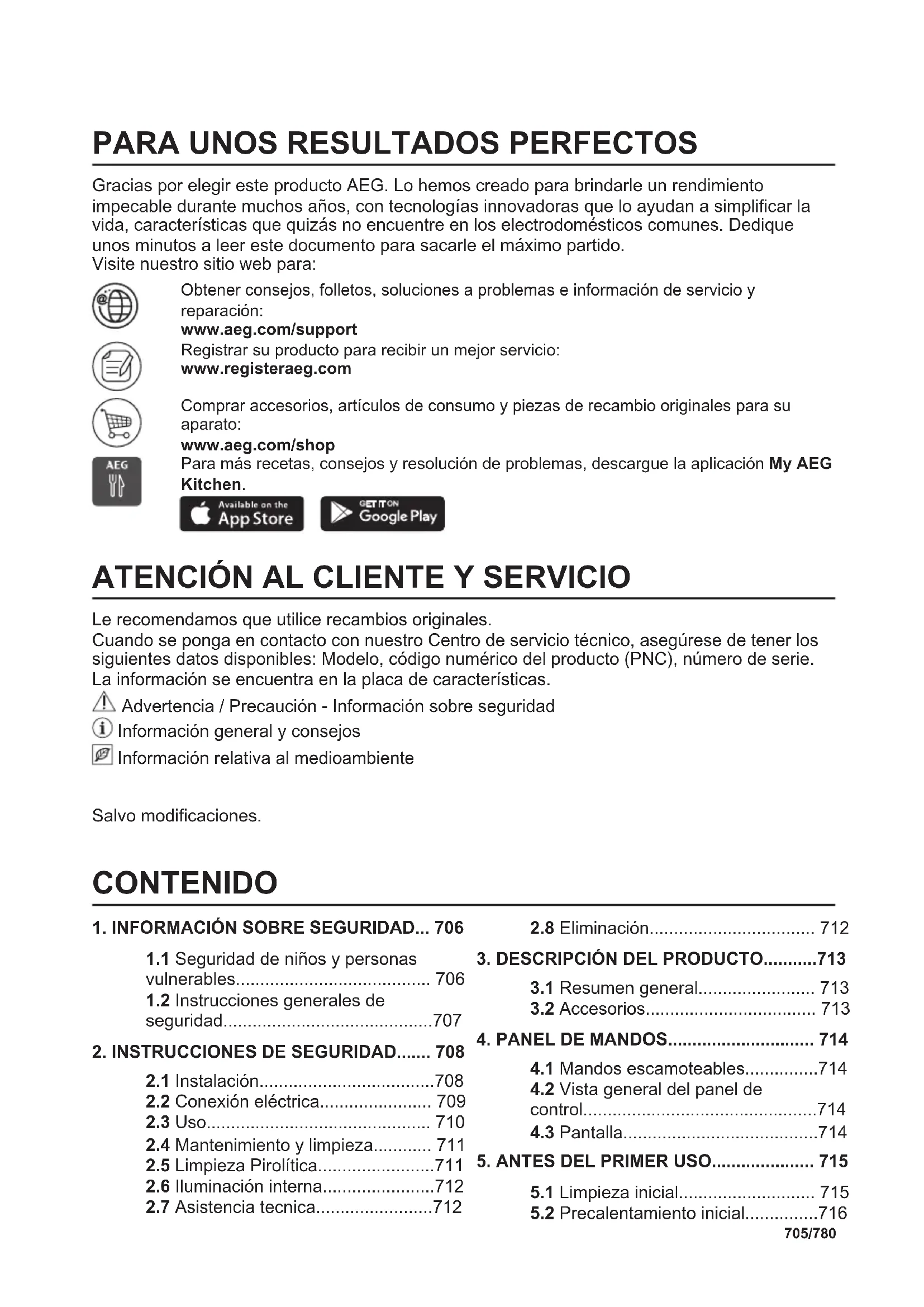 Gracias por elegir este producto AEG. Lo hemos creado para brindarle un rendimiento impecable durante muchos años, con tecnologías innovadoras que lo ayudan a simplificar la vida, características que quizás no encuentre en los electrodomésticos comunes. Dedique unos minutos a leer este documento para sacarle el máximo partido. Visite nuestro sitio web para: Obtener consejos, folletos, soluciones a problemas e información de servicio y reparación: www.aeg.com/support Registrar su producto para recibir un mejor servicio: www.registeraeg.com Comprar accesorios, artículos de consumo y piezas de recambio originales para su aparato: www.aeg.com/shop Para más recetas, consejos y resolución de problemas, descargue la aplicación My AEG Kitchen.
