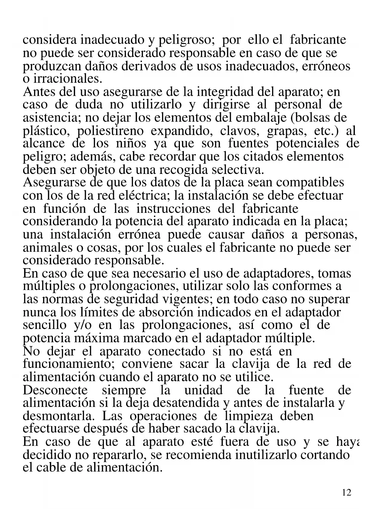 A continuación se presentan importantes indicaciones sobre la instalación, el uso y el mantenimiento. Conservar con cuidado este manual para cualquier consulta posterior; utilizar el producto solo de la manera que indica este manual de instrucciones; cualquier otro uso se12 considera inadecuado y peligroso; por ello el fabricante no puede ser considerado responsable en caso de que se produzcan daños derivados de usos inadecuados, erróneos o irracionales. Antes del uso asegurarse de la integridad del aparato; en caso de duda no utilizarlo y dirigirse al personal de asistencia; no dejar los elementos del embalaje (bolsas de plástico, poliestireno expandido, clavos, grapas, etc.) al alcance de los niños ya que son fuentes potenciales de peligro; además, cabe recordar que los citados elementos deben ser objeto de una recogida selectiva. Asegurarse de que los datos de la placa sean compatibles con los de la red eléctrica; la instalación se debe efectuar en función de las instrucciones del fabricante considerando la potencia del aparato indicada en la placa; una instalación errónea puede causar daños a personas, animales o cosas, por los cuales el fabricante no puede ser considerado responsable. En caso de que sea necesario el uso de adaptadores, tomas múltiples o prolongaciones, utilizar solo las conformes a las normas de seguridad vigentes; en todo caso no superar nunca los límites de absorción indicados en el adaptador sencillo y/o en las prolongaciones, así como el de potencia máxima marcado en el adaptador múltiple. No dejar el aparato conectado si no está en funcionamiento; conviene sacar la clavija de la red de alimentación cuando el aparato no se utilice. Desconecte siempre la unidad de la fuente de alimentación si la deja desatendida y antes de instalarla y desmontarla. Las operaciones de limpieza deben efectuarse después de haber sacado la clavija. En caso de que al aparato esté fuera de uso y se haya decidido no repararlo, se recomienda inutilizarlo cortando el cable de alimentación.13 No acercar el cable de alimentación a objetos cortantes o a superficies calientes y no tirar del mismo para sacar la clavija. No deje que cuelgue de la superficie de trabajo donde un niño pueda sostenerla. No utilizar el producto en caso de daños en el cable de alimentación, en la clavija o en caso de cortocircuitos; llevar a reparar el producto por parte de un centro de asistencia autorizado. - No exponer el producto a condiciones atmosféricas adversas como lluvia, humedad, hielo, etc. Conservarlo en lugares secos. No manejar o tocar el producto con las manos húmedas o los pies descalzos. - Este aparato puede ser utilizado por niños a partir de 8 años y por personas con capacidades físicas, sensoriales o mentales reducidas o con falta de experiencia o conocimiento si a dichas personas se ha asegurado una supervisión adecuada o bien si han recibido instrucciones sobre el uso seguro del aparato; las operaciones de limpieza y de mantenimiento no deben ser efectuadas por niños a no ser que tengan más de 8 años y estén supervisados. - Los niños no deben jugar con el aparato. - Mantener el producto y el cable fuera del alcance de los niños menores de 8 años. - No apto para uso comercial. Solo para uso doméstico En caso de avería y/o de funcionamiento anómalo no manipular el aparato. Para una posible reparación, dirigirse únicamente a un centro autorizado por el fabricante y solicitar el uso de recambios originales. El incumplimiento de lo indicado anteriormente puede comprometer la seguridad del aparato y anular las condiciones de la garantía. Este aparato está diseñado para uso doméstico o similares: cocinas para el personal de tiendas, oficinas u otros centros de trabajo, para clientes de hoteles, moteles,14 hostales y similares. El aparato no está diseñado para su uso a través de temporizadores externos o mandos a distancia. Antes de cada uso, desenrolle el cable de alimentación. Utilice únicamente piezas de repuesto y accesorios originales. No someta el producto a impactos fuertes se producirán daños serios. Manter o aparelho afastado de materiais inflamáveis, fontes de calor, zonas frias e vapor.
