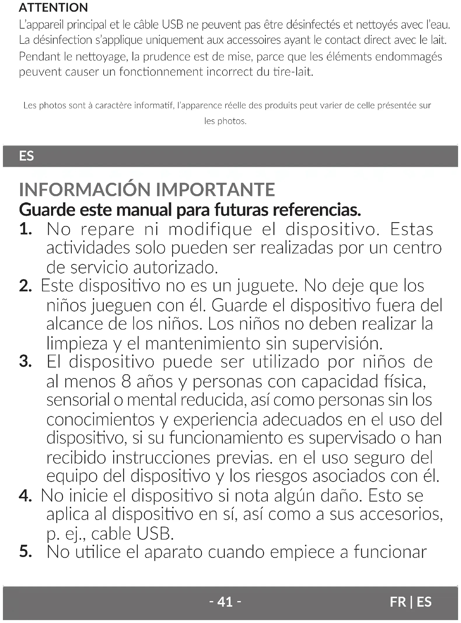 un lavavajillas. PRECAUCIÓN La unidad principal y el cable USB no se pueden desinfectar ni limpiar con agua. La desinfección se aplica solo a los accesorios que entran en contacto directo con la leche. Tenga cuidado al limpiar, ya que las piezas dañadas pueden hacer que el extractor de leche no funcione correctamente. Las fotos solo enen carácter ilustravo, el aspecto real de los productos puede diferir de los presentados en las fotos.