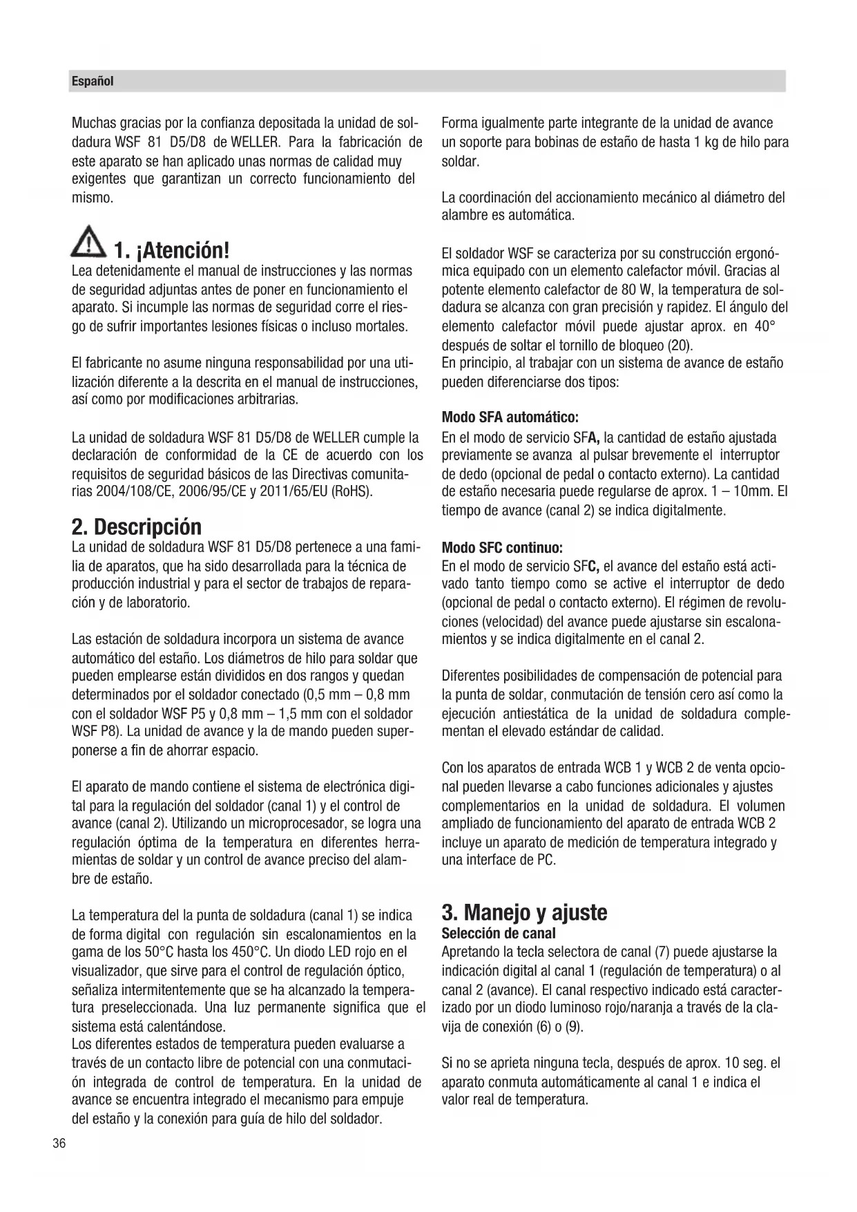 Lea detenidamente el manual de instrucciones y las normas de seguridad adjuntas antes de poner en funcionamiento el aparato. Si incumple las normas de seguridad corre el ries- go de sufrir importantes lesiones físicas o incluso mortales. El fabricante no asume ninguna responsabilidad por una uti- lización diferente a la descrita en el manual de instrucciones, así como por modificaciones arbitrarias. La unidad de soldadura WSF 81 D5/D8 de WELLER cumple la declaración de conformidad de la CE de acuerdo con los requisitos de seguridad básicos de las Directivas comunita- rias 2004/108/CE, 2006/95/CE y 2011/65/EU (RoHS).