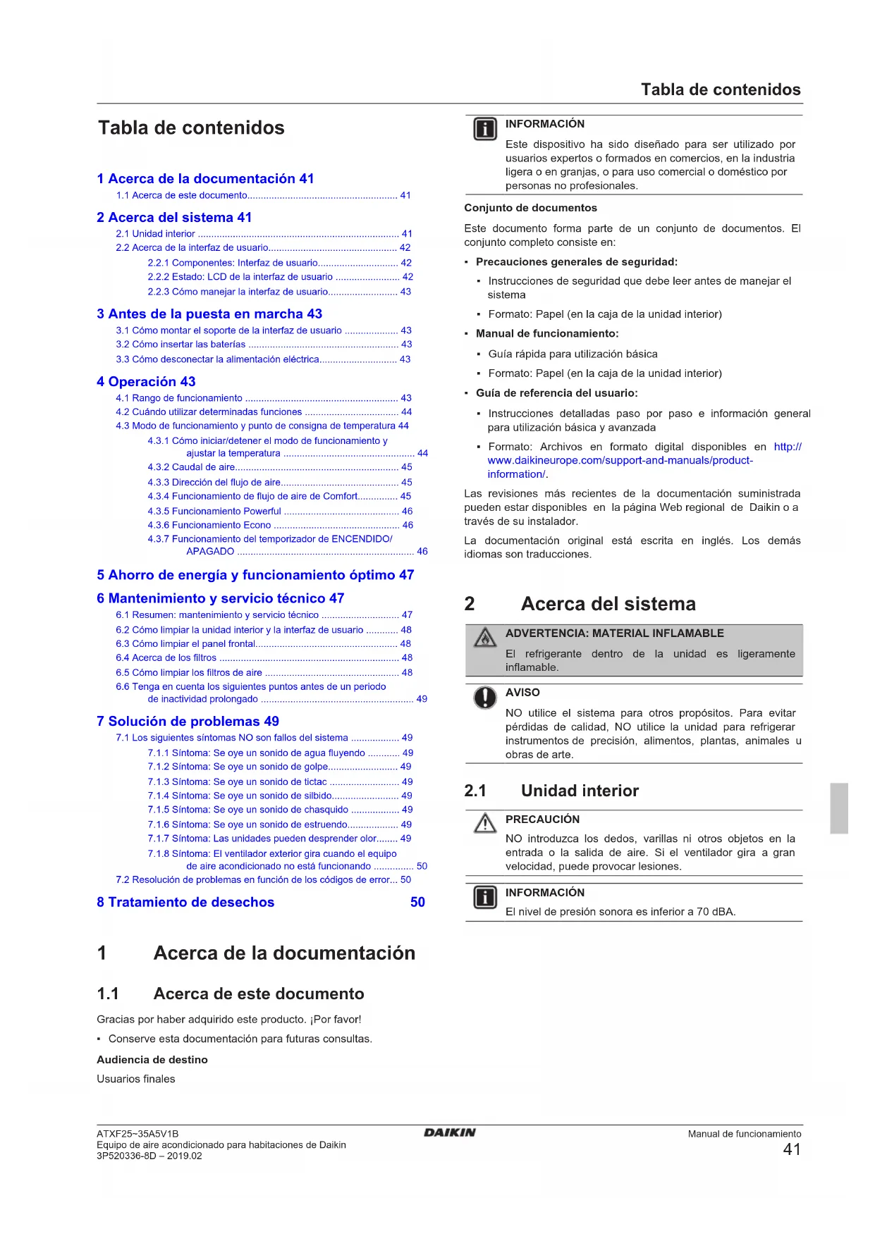 Equipo de aire acondicionado para habitaciones de Daikin 3P520336-8D – 2019.02 Tabla de contenidos 1 Acerca de la documentación 41