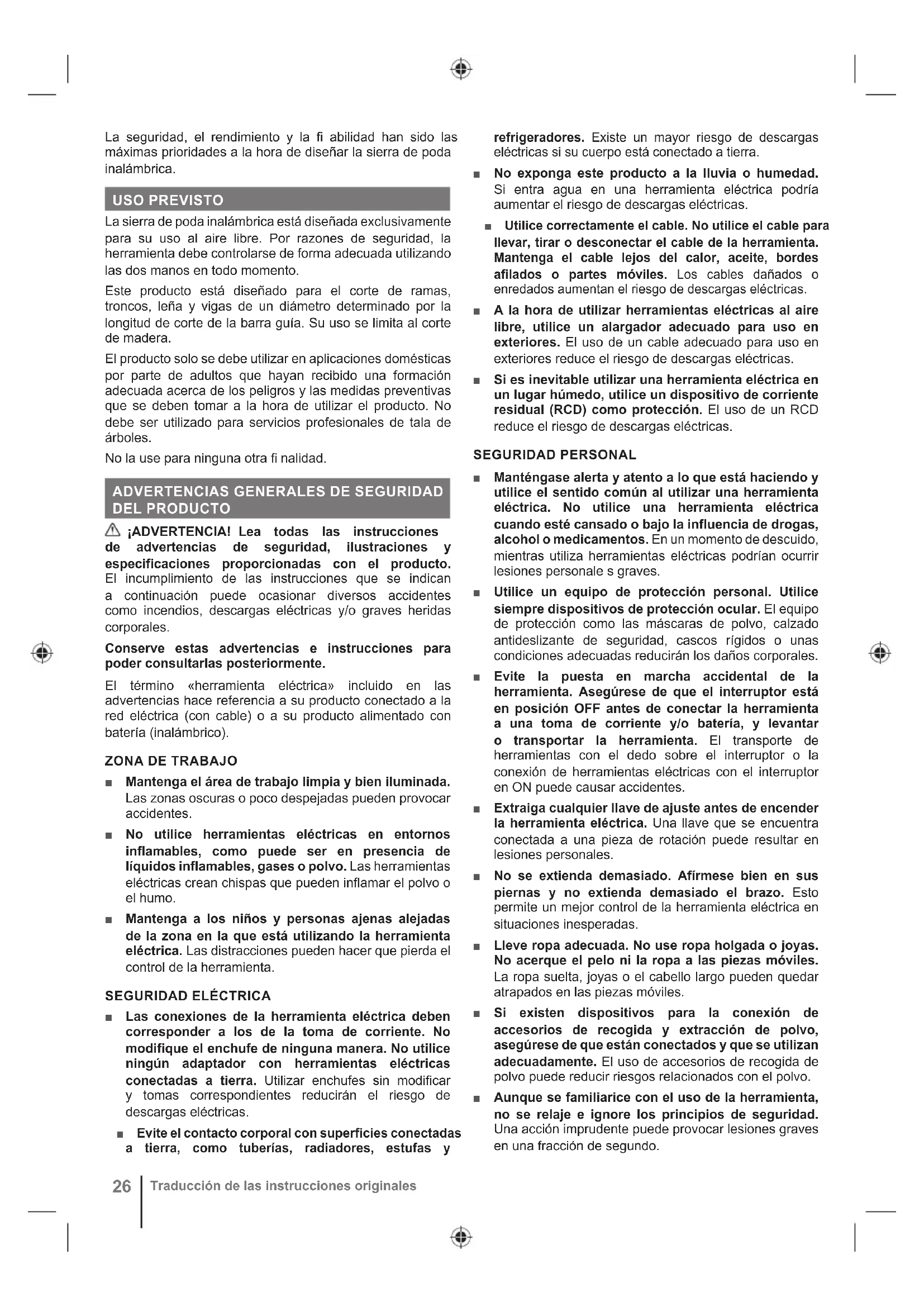 Drücken Sie die Freigabe des Ein-/Ausschalters und drücken Sie den Ein-/Ausschalter. HINWEIS: Um das Gerät auszuschalten, lassen Sie den Ein-/Ausschalter los.26 Traducción de las instrucciones originales La seguridad, el rendimiento y la fi abilidad han sido las máximas prioridades a la hora de diseñar la sierra de poda inalámbrica. USO PREVISTO La sierra de poda inalámbrica está diseñada exclusivamente para su uso al aire libre. Por razones de seguridad, la herramienta debe controlarse de forma adecuada utilizando las dos manos en todo momento. Este producto está diseñado para el corte de ramas, troncos, leña y vigas de un diámetro determinado por la longitud de corte de la barra guía. Su uso se limita al corte de madera. El producto solo se debe utilizar en aplicaciones domésticas por parte de adultos que hayan recibido una formación adecuada acerca de los peligros y las medidas preventivas que se deben tomar a la hora de utilizar el producto. No debe ser utilizado para servicios profesionales de tala de árboles. No la use para ninguna otra fi nalidad.