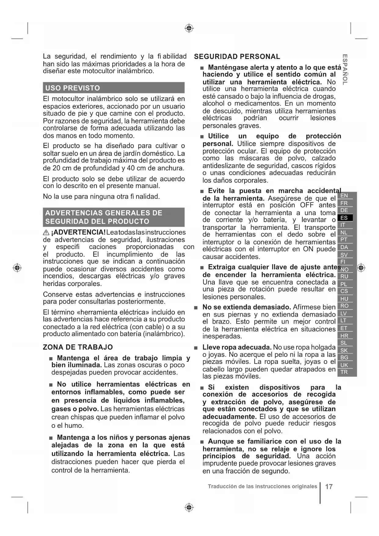 La seguridad, el rendimiento y la fi abilidad han sido las máximas prioridades a la hora de diseñar este motocultor inalámbrico. USO PREVISTO El motocultor inalámbrico solo se utilizará en espacios exteriores, accionado por un usuario situado de pie y que camine con el producto. Por razones de seguridad, la herramienta debe controlarse de forma adecuada utilizando las dos manos en todo momento. El producto se ha diseñado para cultivar o soltar suelo en un área de jardín doméstico. La profundidad de trabajo máxima del producto es de 20 cm de profundidad y 40 cm de anchura. El producto solo se debe utilizar de acuerdo con lo descrito en el presente manual. No la use para ninguna otra fi nalidad.
