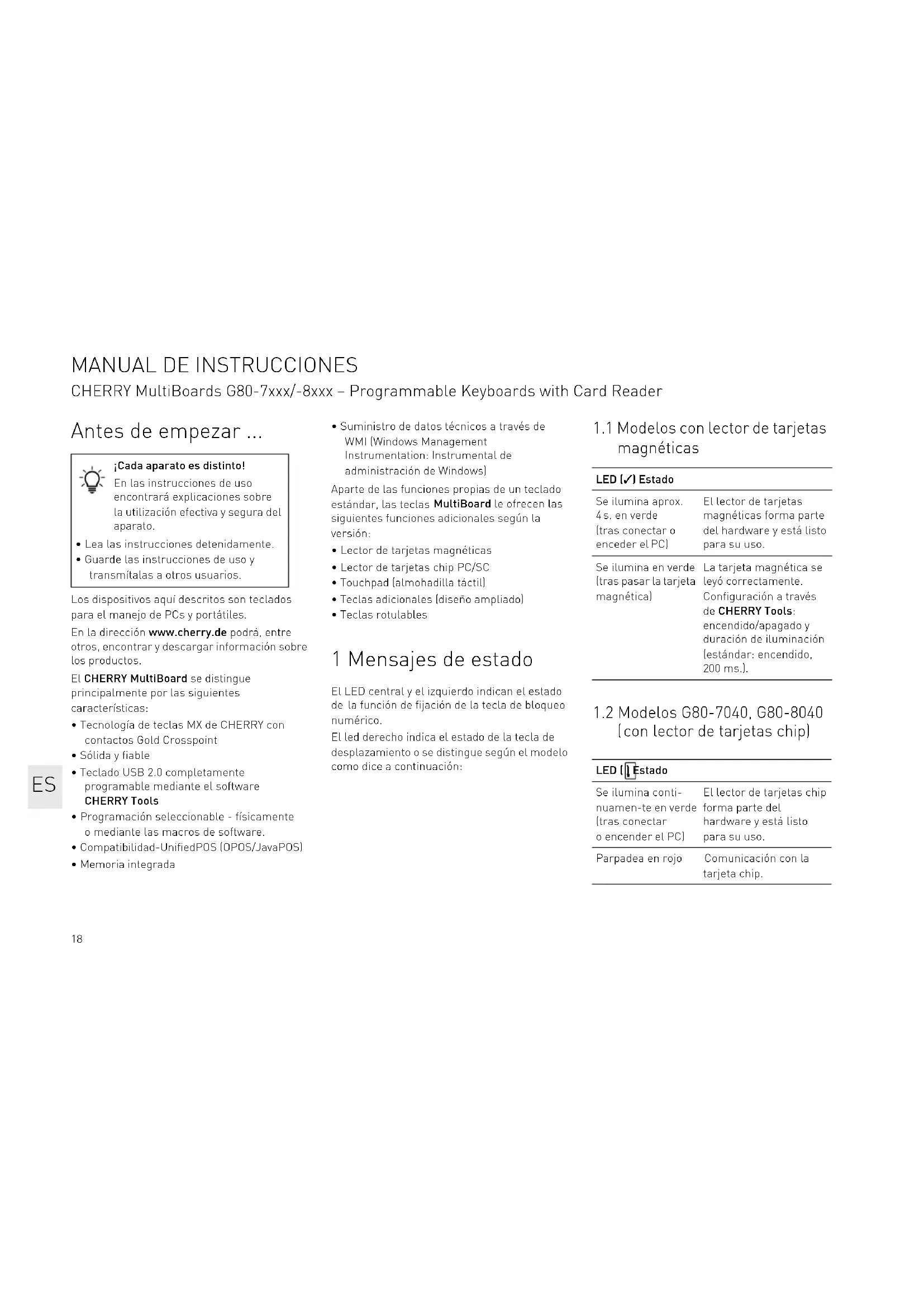 s. en verde (tras conectar o enceder el PC) El lector de tarjetas magnéticas forma parte del hardware y está listo para su uso. Se ilumina en verde (tras pasar la tarjeta magnética) La tarjeta magnética se leyó correctamente. Configuración a través de CHERRY Tools: encendido/apagado y duración de iluminación (estándar: encendido, 200 ms.). LED ( ) Estado Se ilumina conti- nuamen-te en verde (tras conectar o encender el PC) El lector de tarjetas chip forma parte del hardware y está listo para su uso. Parpadea en rojo Comunicación con la tarjeta chip.