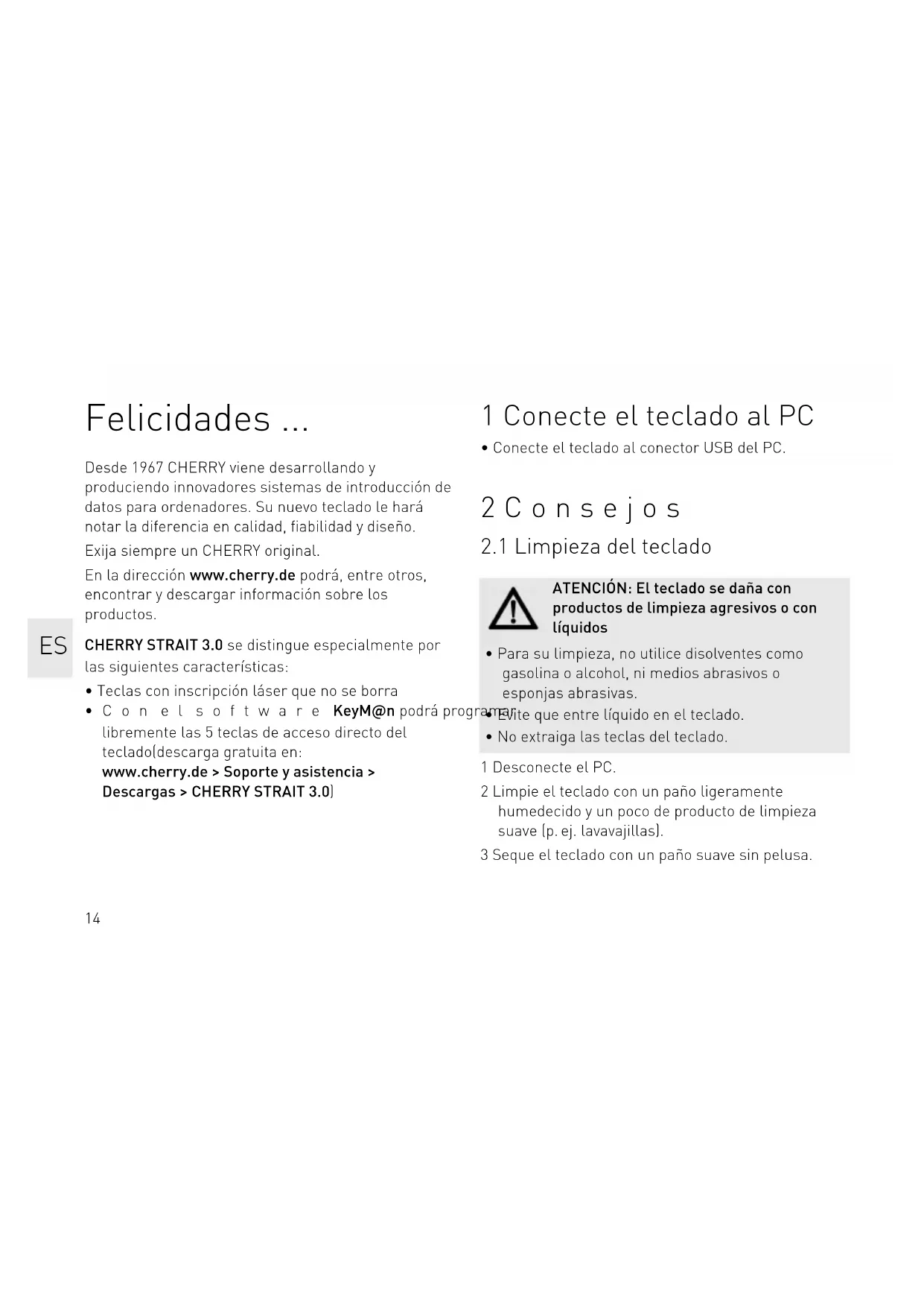 - Con el software KeyM@n podrá programar libremente las 5 teclas de acceso directo del teclado(descarga gratuita en: www.cherry.de > Soporte y asistencia > Descargas > CHERRY STRAIT 3.0) 1 Conecte el teclado al PC
