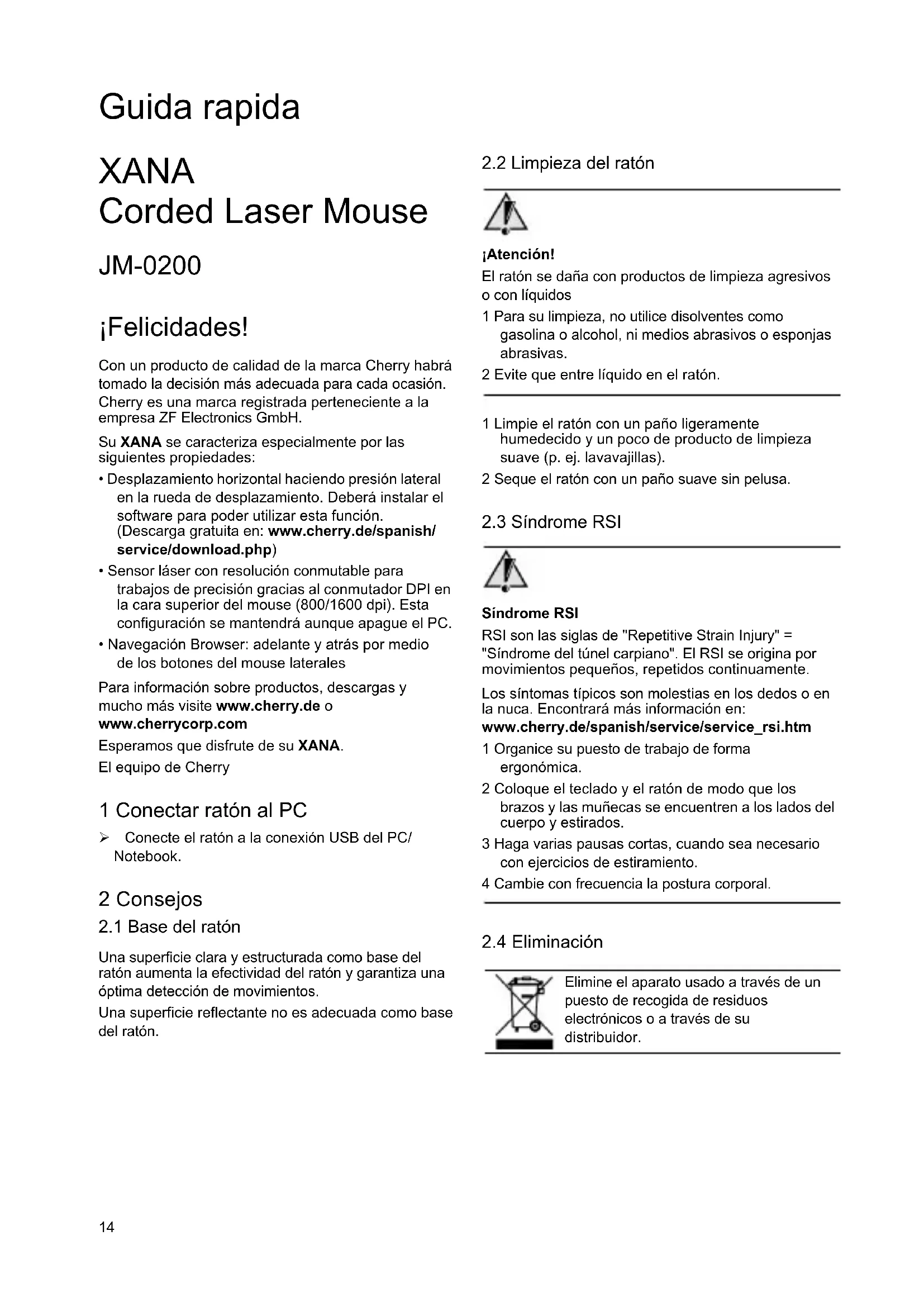 - Navegación Browser: adelante y atrás por medio de los botones del mouse laterales Para información sobre productos, descargas y mucho más visite www.cherry.de o www.cherrycorp.com Esperamos que disfrute de su XANA. El equipo de Cherry 1 Conectar ratón al PC ¾ Conecte el ratón a la conexión USB del PC/ Notebook. 2 Consejos