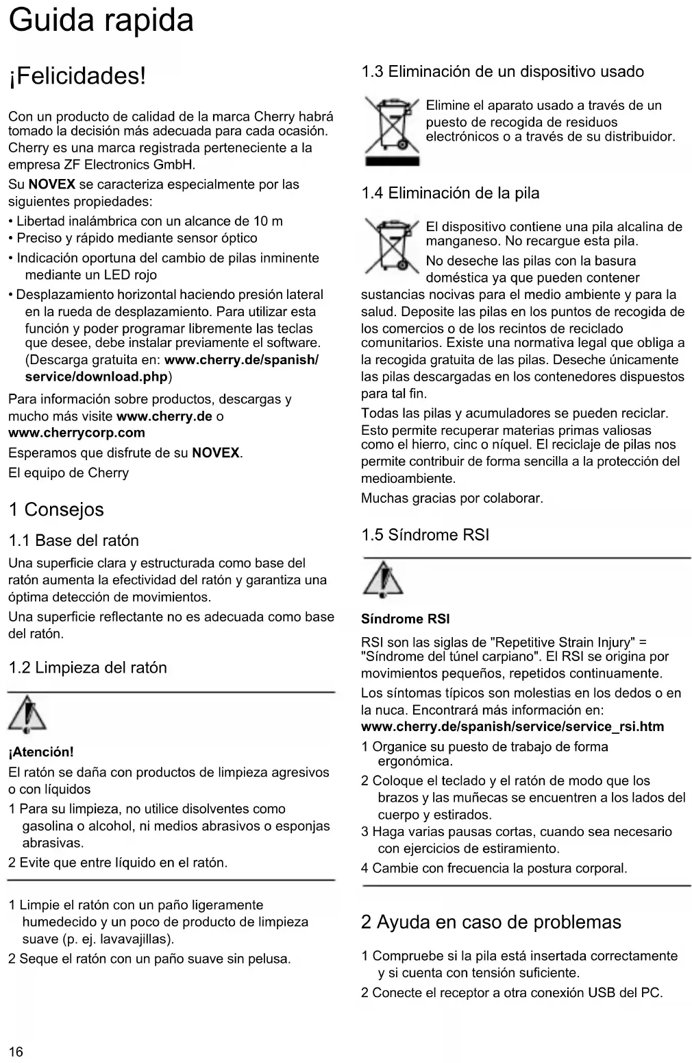 - Desplazamiento horizontal haciendo presión lateral en la rueda de desplazamiento. Para utilizar esta función y poder programar libremente las teclas que desee, debe instalar previamente el software. (Descarga gratuita en: www.cherry.de/spanish/ service/download.php) Para información sobre productos, descargas y mucho más visite www.cherry.de o www.cherrycorp.com Esperamos que disfrute de su NOVEX. El equipo de Cherry 1 Consejos